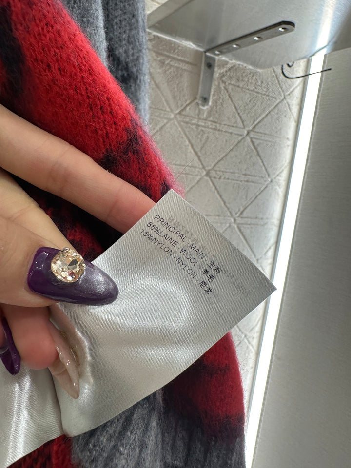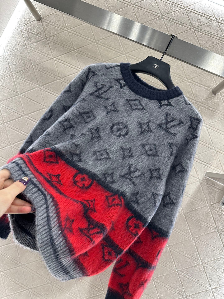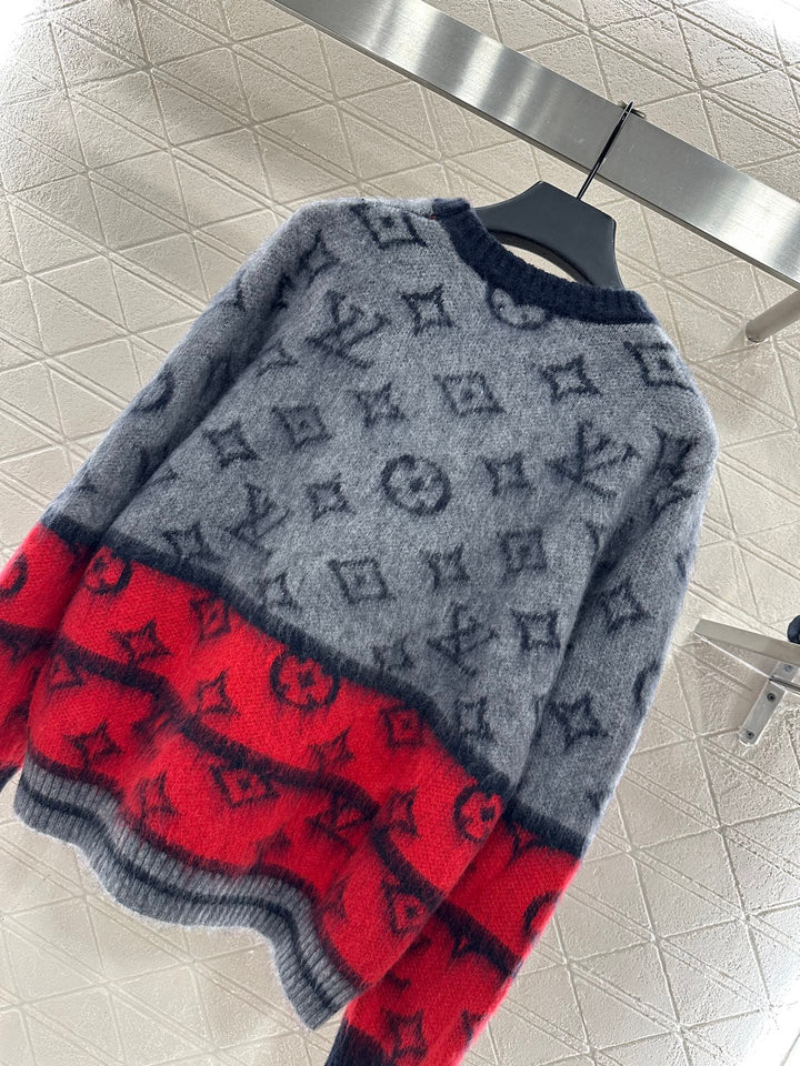 Woolen yarn weaving, premium texture, comfortable to wear without tying the body, round neck pullover sweater cut, oversized version, visually slimming and relaxed, with gray as the main body, collar cuffs and hem edging to outline the contour, and the lower half surrounded to the back with red color blocks, full of artistic charm. The large four leaf clover letter jacquard logo establishes the style of Lao Qian Literature and Art Academy, and the trend of layering is fashionable.