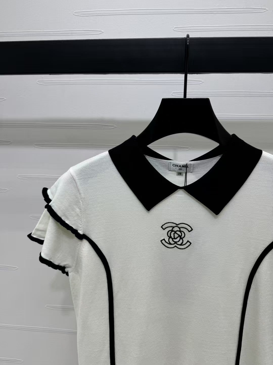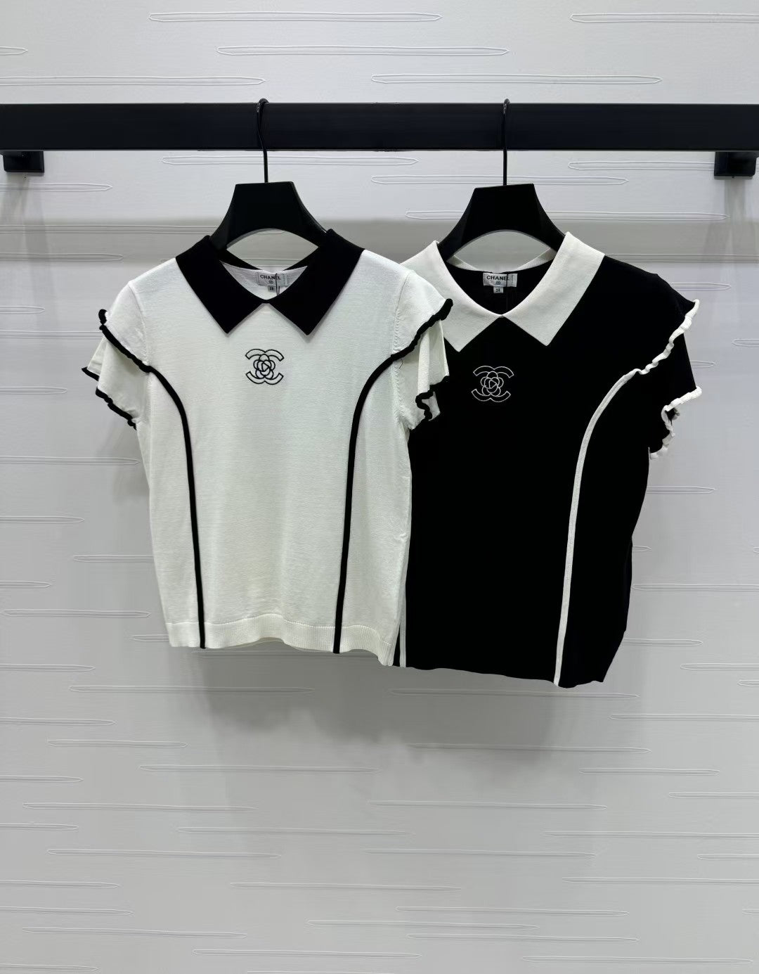 The latest series of 2025 spring and summer! Lace lapel knitted short sleeves! Custom imported yarn weaving, soft and skin-friendly, delicate texture, lapel knitted short sleeves, cuffs use contrasting wood ear lace texture short sleeves, with contrasting colors on the collar and hem to form a multi-level collision, letter logo decoration on the chest, strong retro style, regular version highlights the figure, easy to control for daily travel or parties!