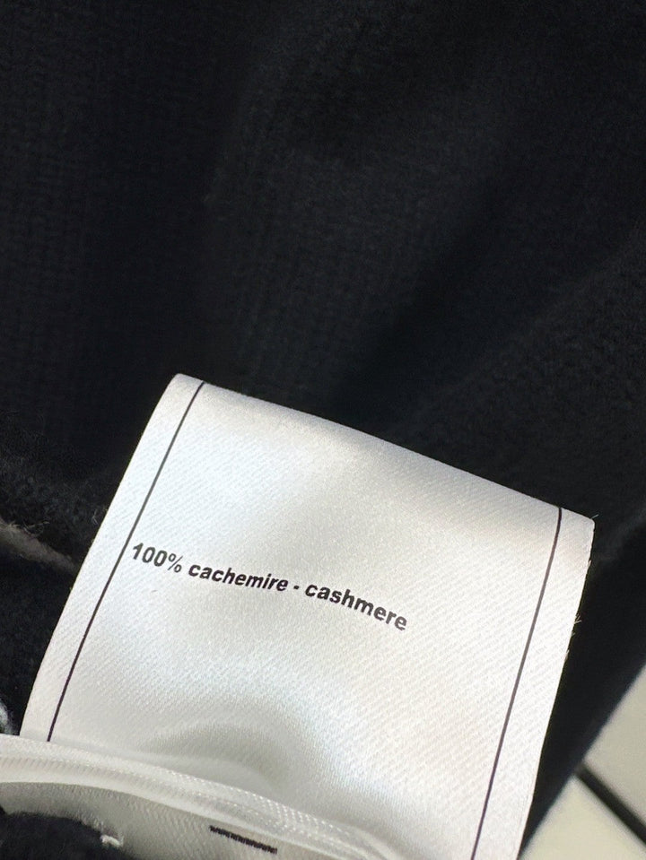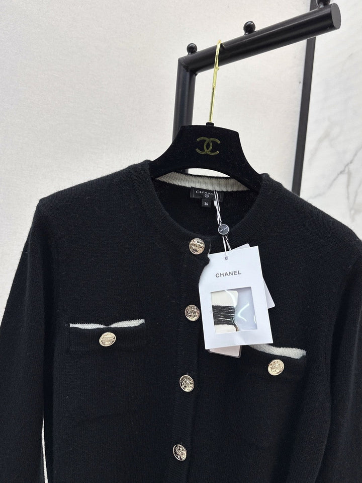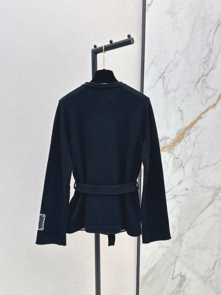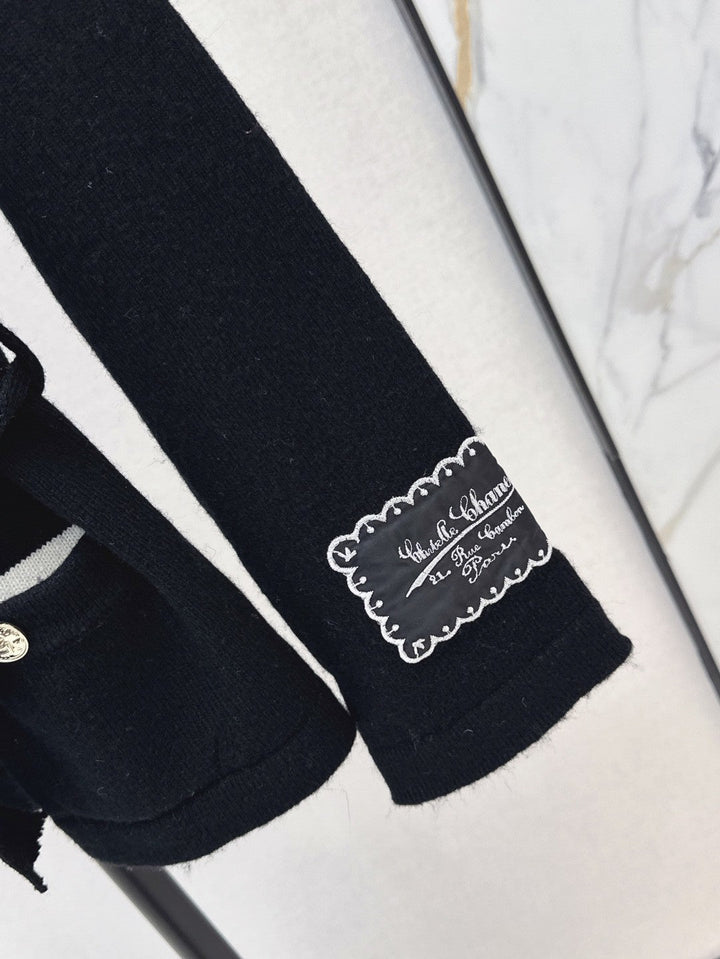 Custom cashmere yarn weaving, high-quality texture and comfortable. Round neck, long sleeve knitted cardigan cut, just the right amount of skin exposed to the neck and shoulders, slimming and elegant. Contrast color binding on the front and inside of the pocket edges enriches the visual effect. Embroidered floral border letter logo decoration on the cuffs shows a light luxury and fashionable temperament. Can be worn alone or layered.