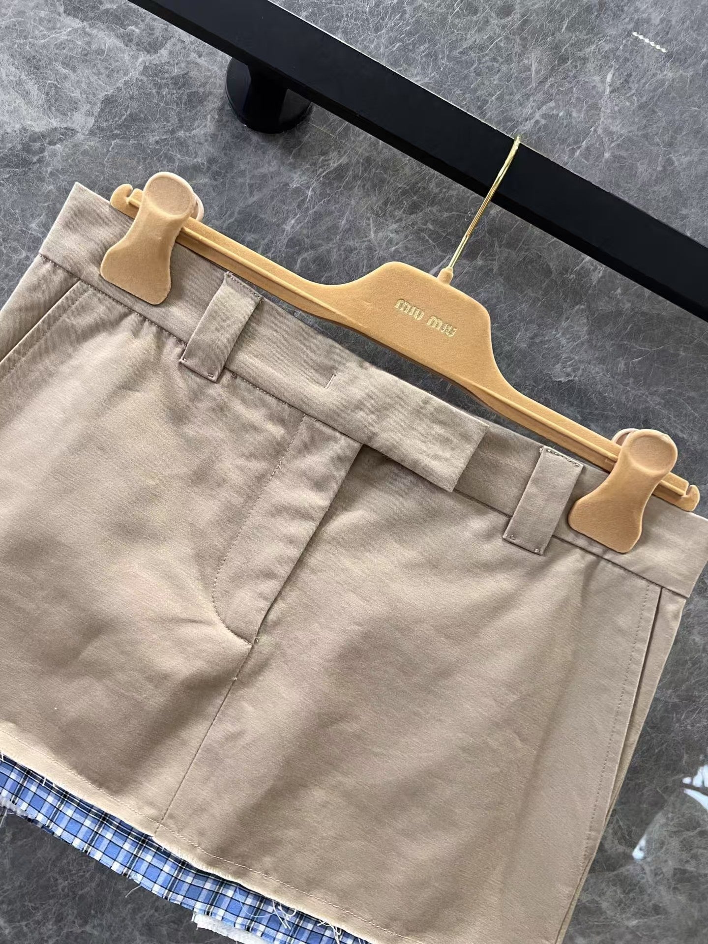 25ss early spring new retro art style khaki ultra-short skirt sky blue plaid splicing fake two-piece design three-dimensional tailoring low waist h hip skirt upper body super long legs! Casual sweet and cool age-reducing single product! The version is versatile and does not pick people! The back of the letter logo is embroidered
