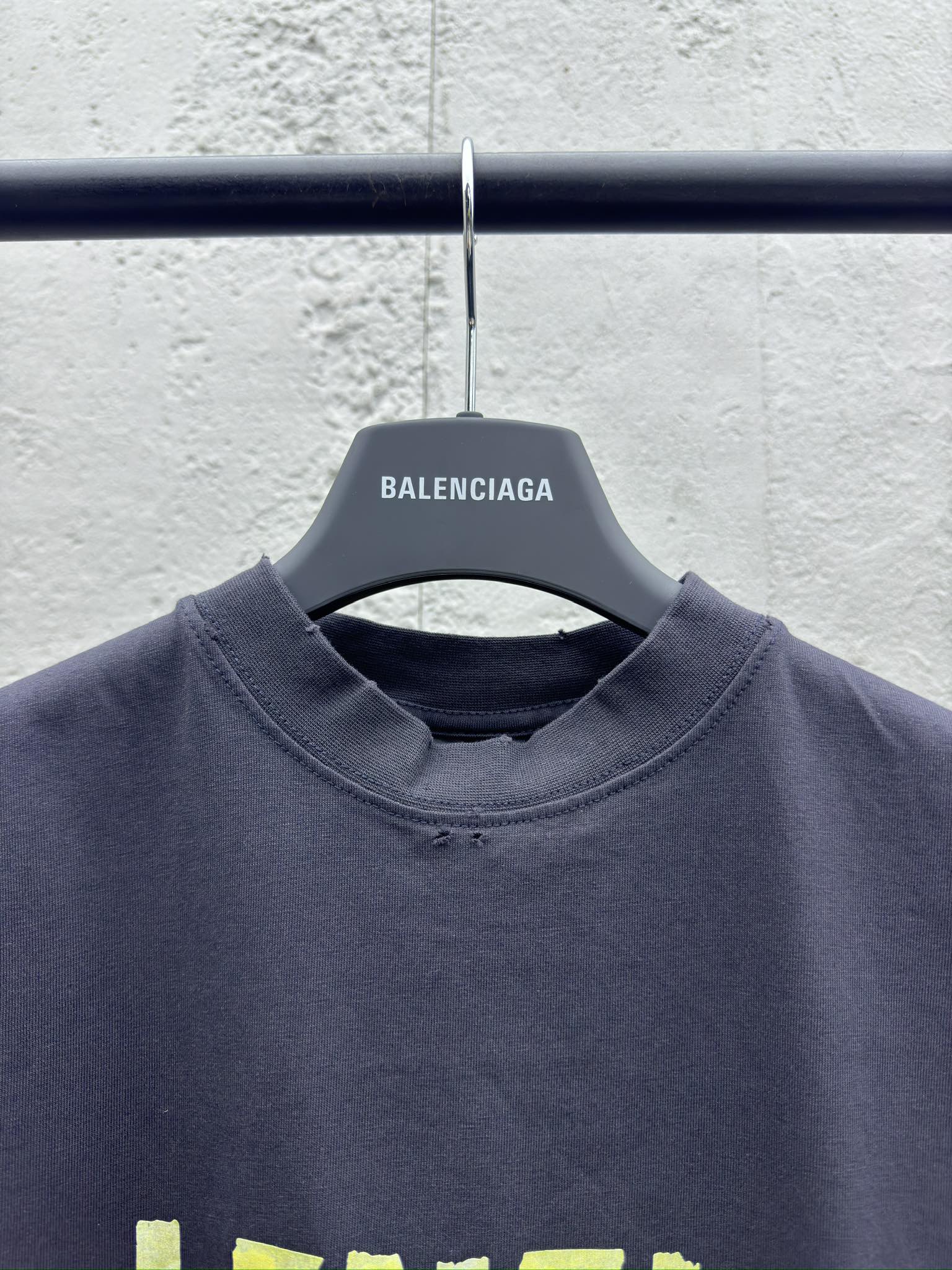 The sleeves and hem are treated with a frayed effect. The lining is clean and has no ends. The shoulders are frayed. The shoulders are stitched with straight three-needle and five-thread craftsmanship. The inner lining of the shoulders is taped. The fabric is made of distressed washed brushing. The collar is frayed and hole-designed ribbing. The fabric is custom-woven and dyed with consistent color and no color difference. Masking paper tape is used on the chest to process the letters. The process of overall weighting is washed. The fabric is comfortable, soft and wear-resistant. The letters on the back are manually aligned and shaped with a hot plate and glue printing process.
