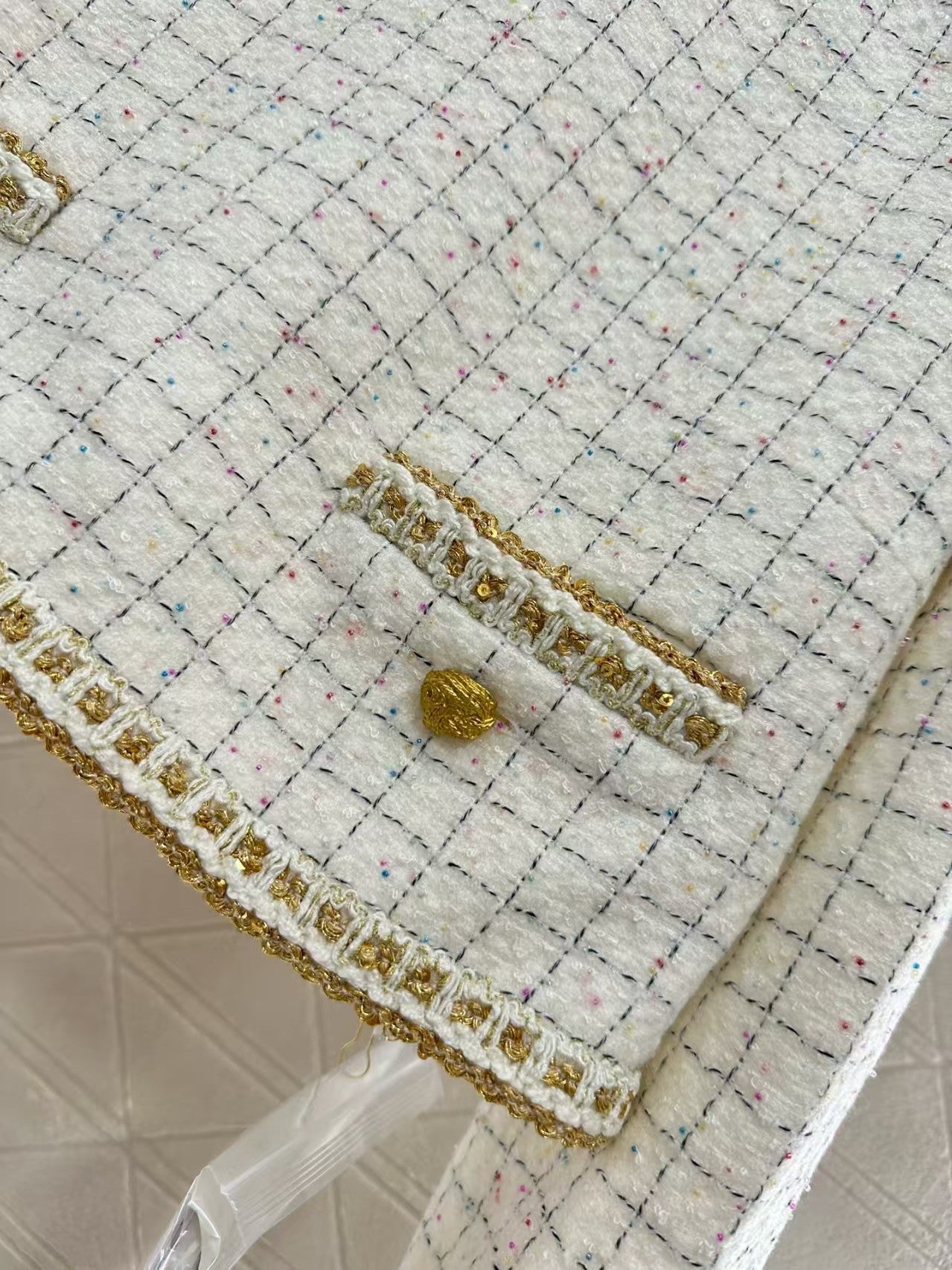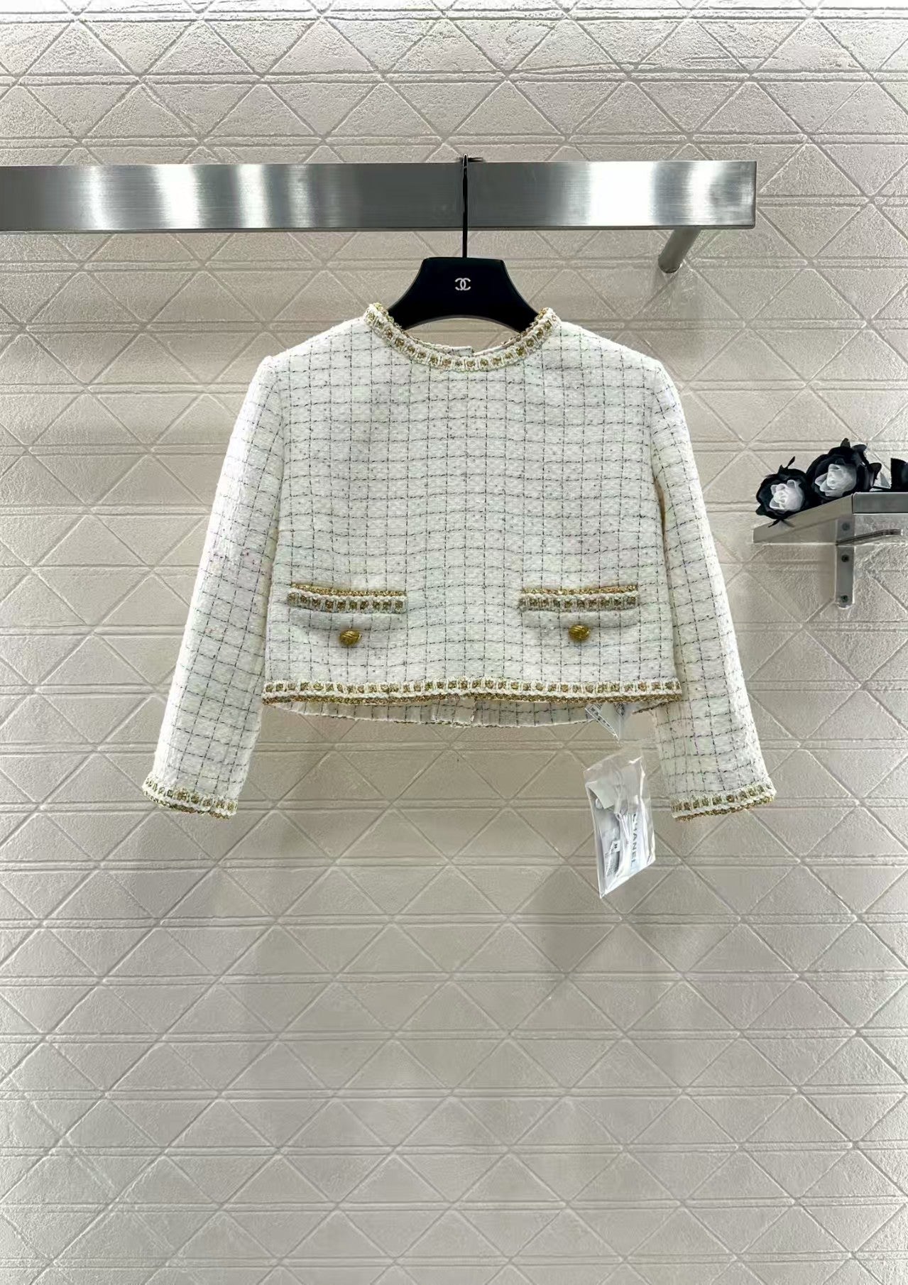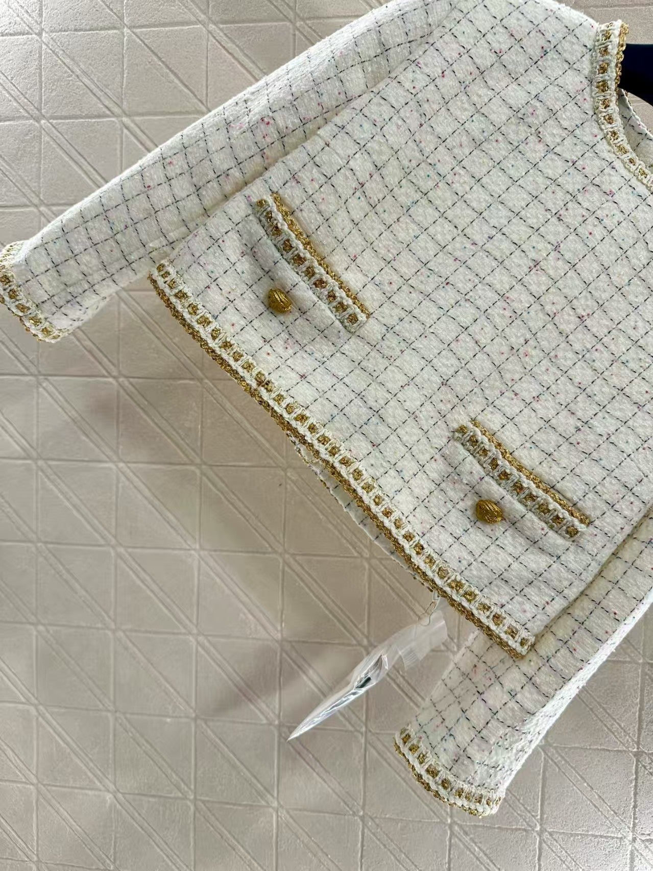Customized YB imported wool tweed material, high-quality and exquisitely presented. The round neck dress top features a straight shoulder design that fits the body perfectly, enhancing the silhouette's slenderness and upright posture. The neckline extends to the hem and cuffs, and three-dimensional hand-bound hems add a touch of detail. The distinctive back button creates a personalized look. Fine yarns are woven throughout to create a plaid pattern that flows throughout the body, creating a sophisticated and elegant look. It perfectly embodies the elegant, sophisticated, and intellectually gentle look of a wealthy woman.