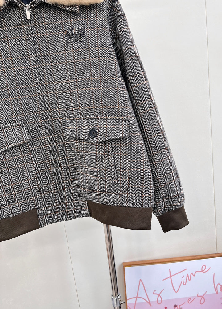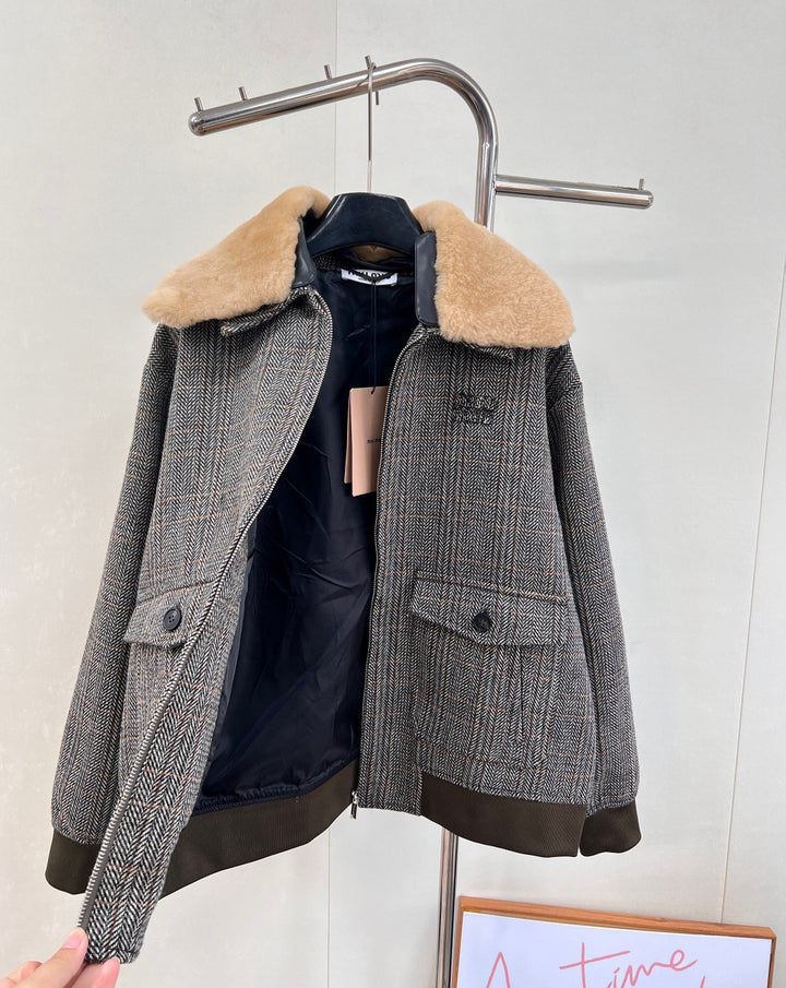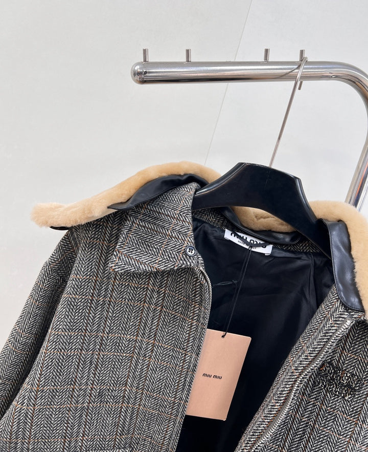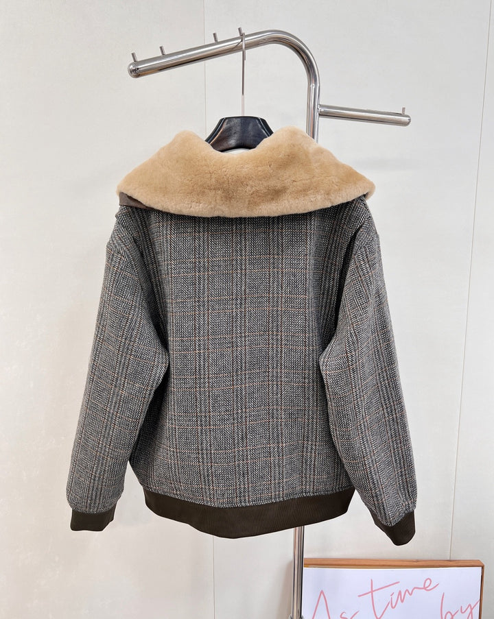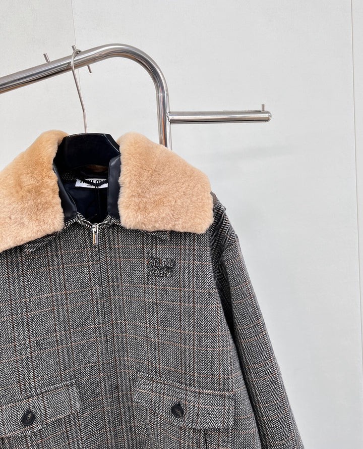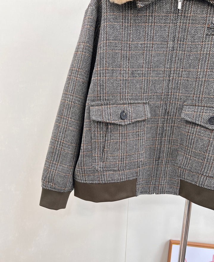 Made of 100% wool material and processed with craftsmanship, it presents a brushed visual experience. The entire piece is lightweight and warm, with a detachable yellow fur collar design. The large black, white, and gray triangle woven texture creates a collision of color and fabric splicing, fully enhancing the design sense. Adopting a flying style, the large capacity pockets on both sides of the flap add three-dimensional dressing, and the iconic letter decoration on the chest presents the brand concept. The detail of the open zipper allows for easy adjustment of on and off, making the upper body lightweight and fashionable. Both autumn and winter outfits are very good 👌, Integrating warmth and fashion.