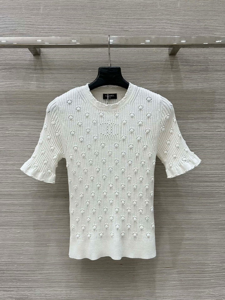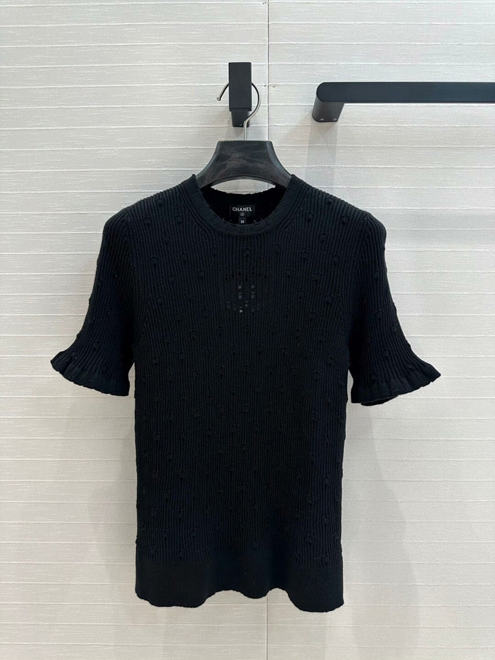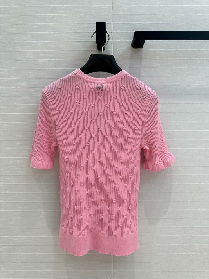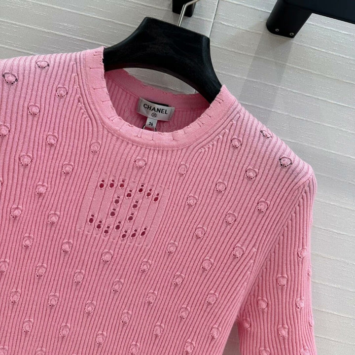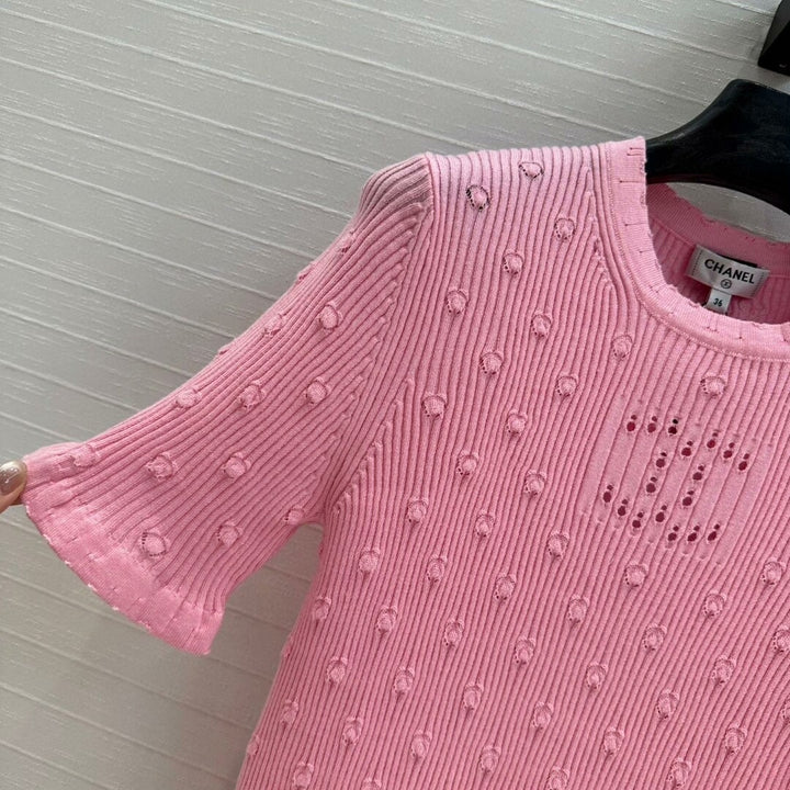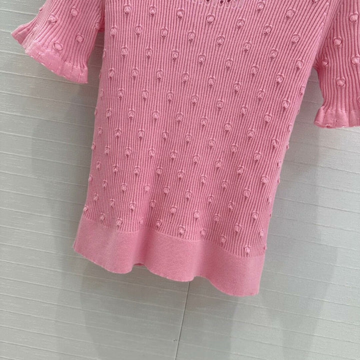 Pink Knitted Hollow Lotus Leaf Sleeve T-shirt