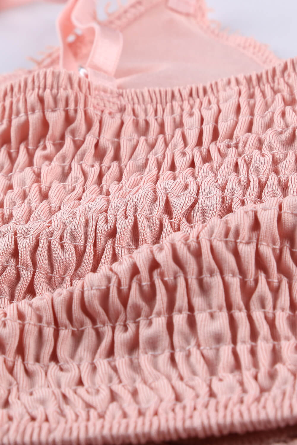 Pink lace bralette with sizable straps and a ribbed back for custom fit. Great paired with a shirt layered on top or as a cropped top.