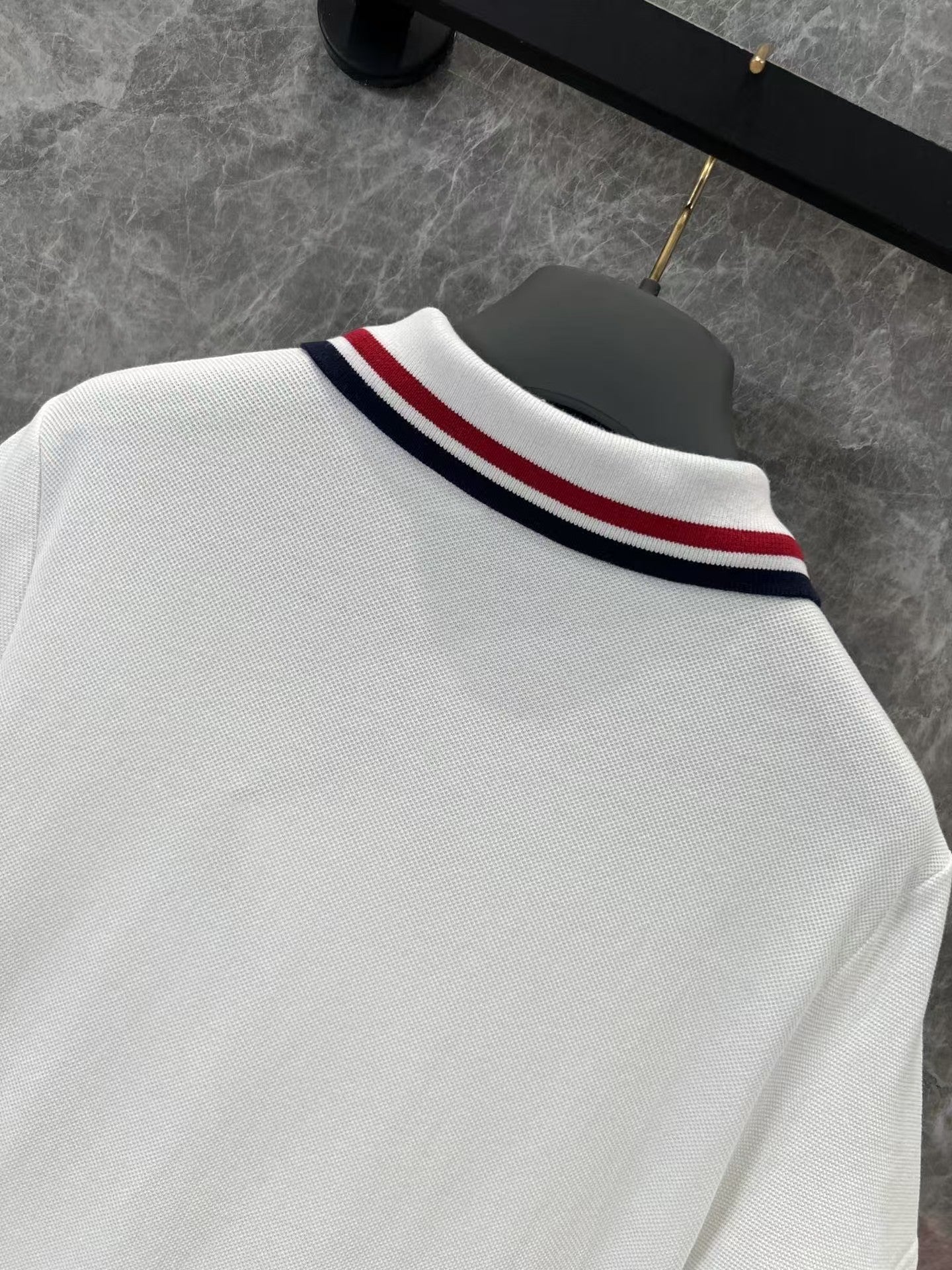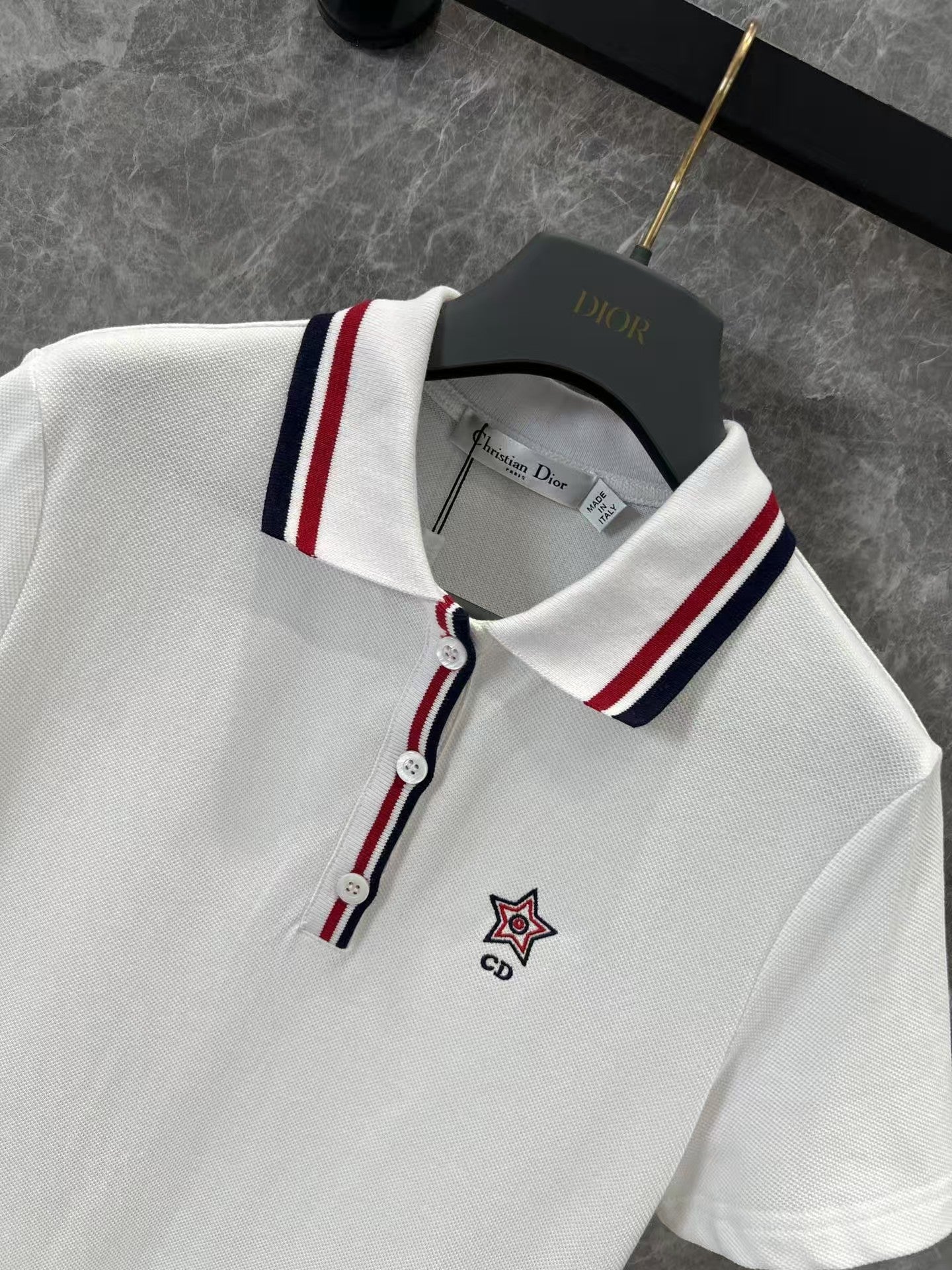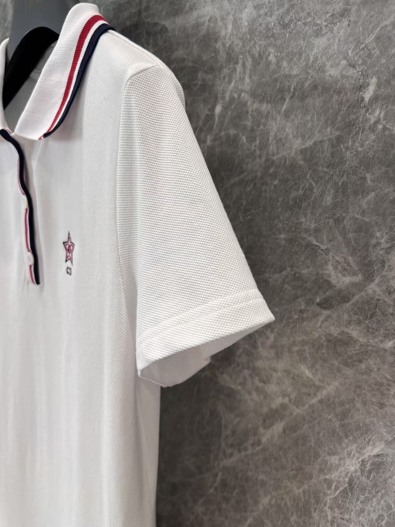 25Ss Spring and Summer New Style College Style Classic Lapel Pleated Dress丨! Made of pure cotton with holes, breathable and comfortable. Lapel pleated dress style. Half-open collar with buttons, adjustable at will. The contrasting colors of the thread are distributed on the front of the collar as a highlight, which echoes the five-pointed star logo on the chest. The low-key highlights the brand's personality charm and enriches the design level. The lower body is divided into proportions with stripes as a dividing line.