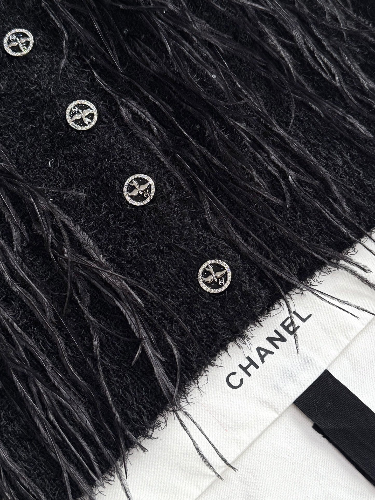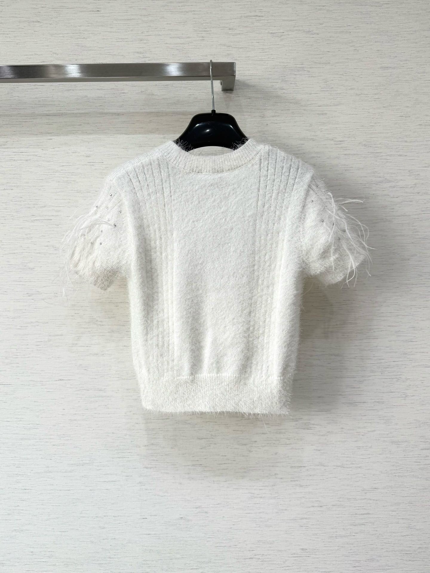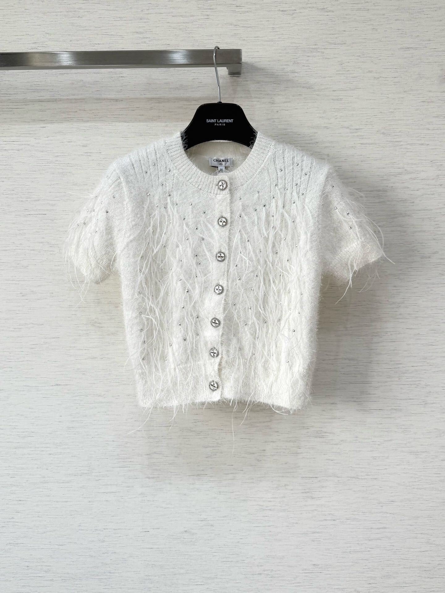 Round neck single-breasted design Crystal hot diamond embellishment Ostrich feather decoration Fluttering spirit fairy full Cotton blended knitting fabric Soft and comfortable Stretch Slim fit Slim and temperament on the body