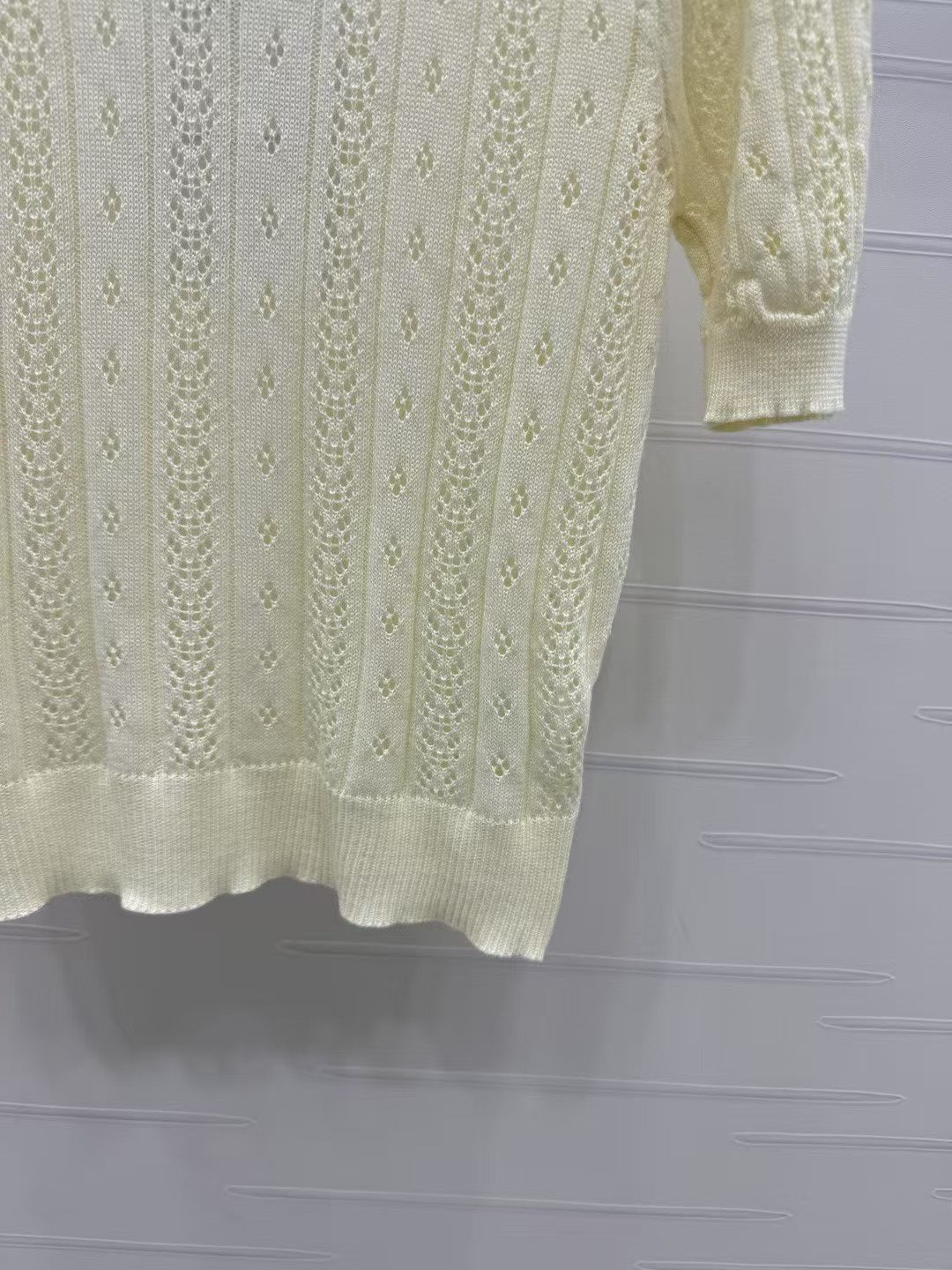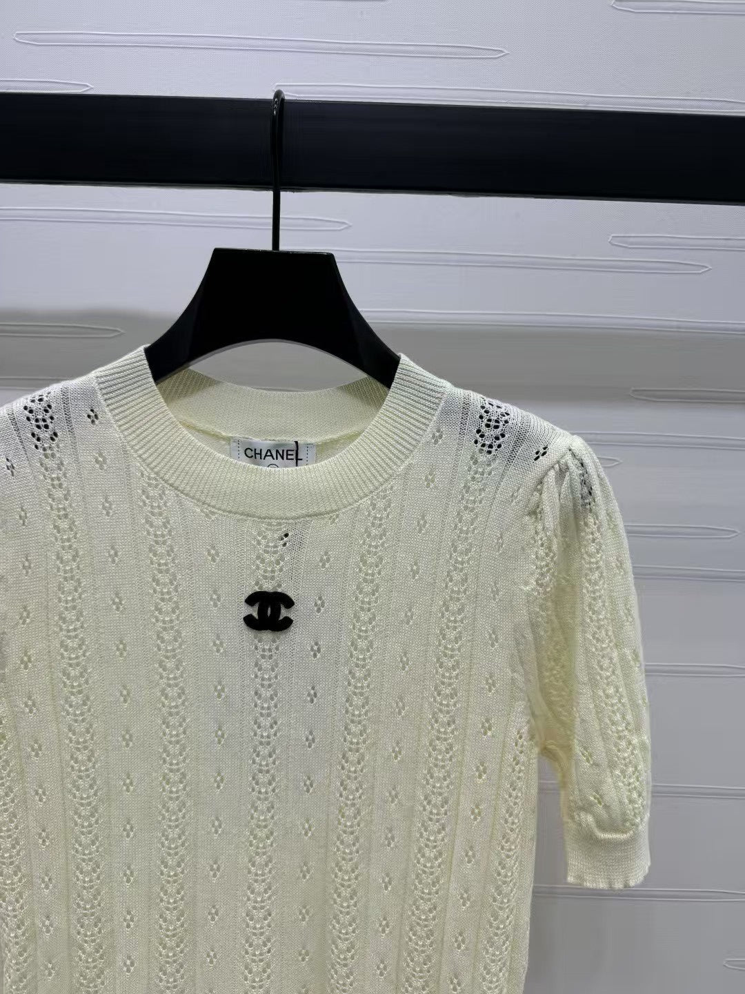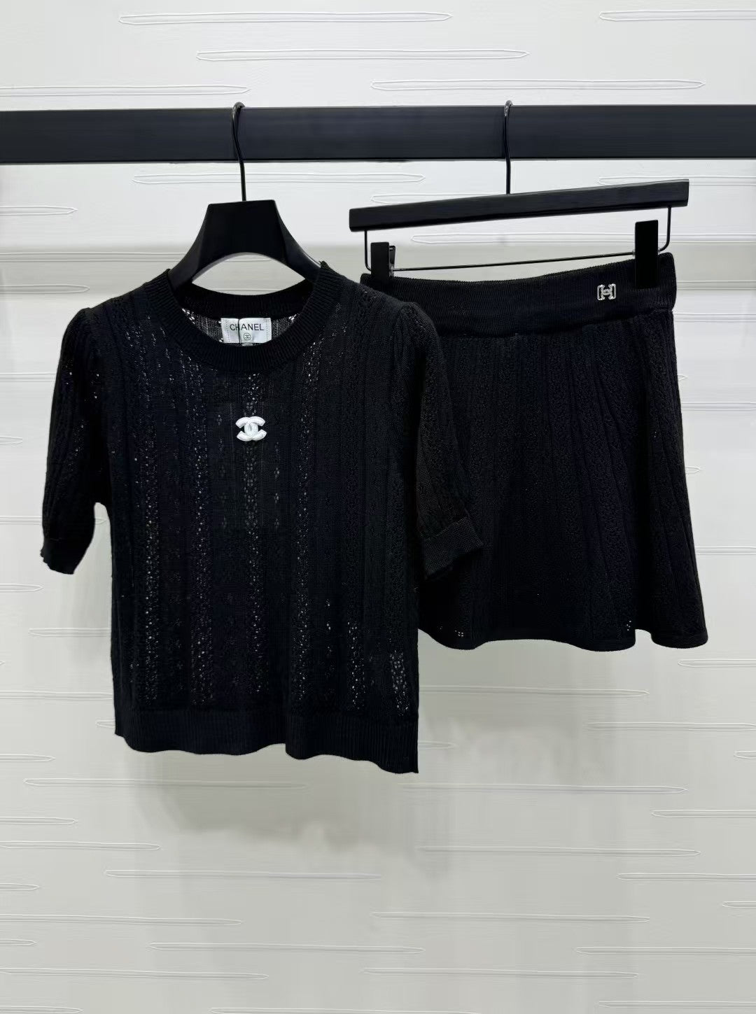 The latest series for spring and summer 2025! Round neck short sleeves➕knitted skirt suit! The whole body is hollowed out and slightly see-through to add a sexy and charming atmosphere. Paired with the same series of skirts. The double C logo on the chest echoes the hardware logo of the skirt. The brand style is immediately highlighted. The design is more refined. The thin waistband divides the upper and lower proportions and highlights the waistline. Designed to match the upper and lower parts. It is easy to wear with elegance. The complete set is fashionable and fashionable.