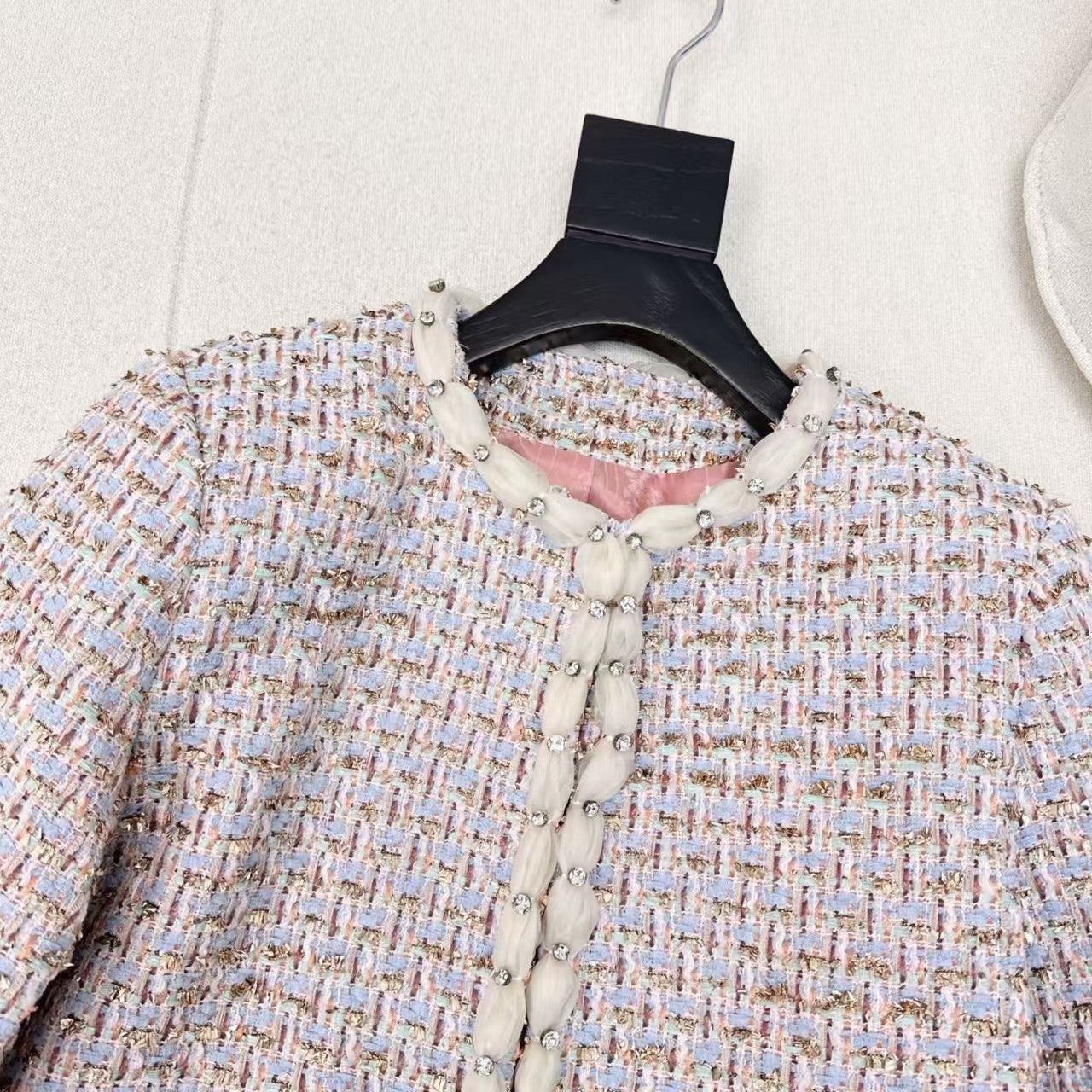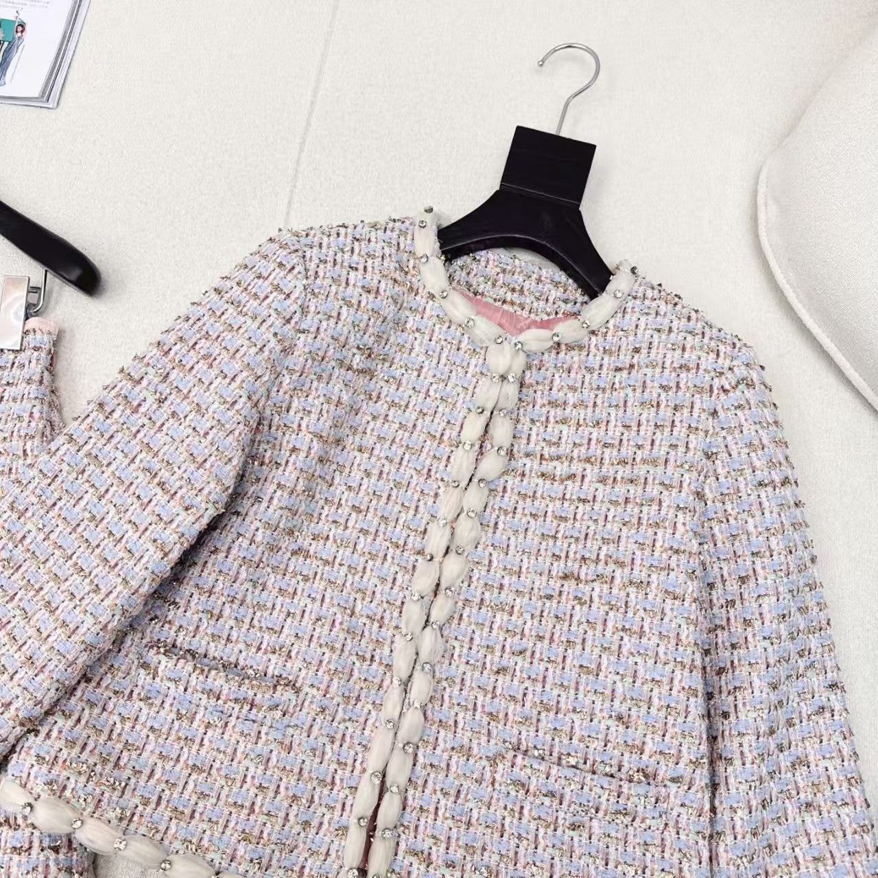 Celebrity style tweed 🤍Round neck trim decoration braid + A-line braided skirt yb developed a variety of yarn braided fabrics with rhinestone trim design details plus points, the upper body is very aura set very high-end not tacky can also be worn separately