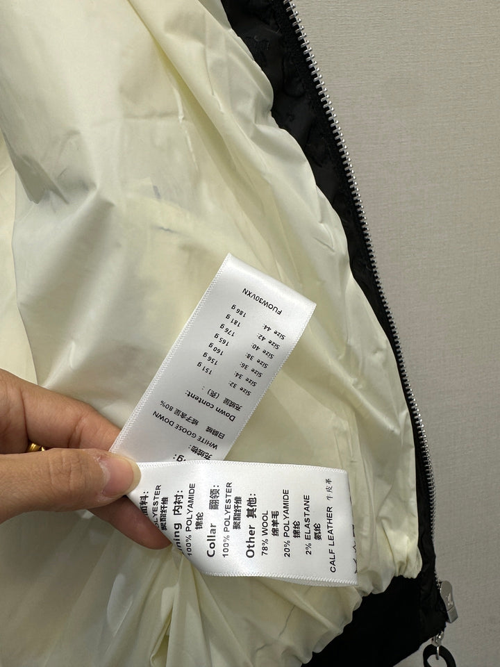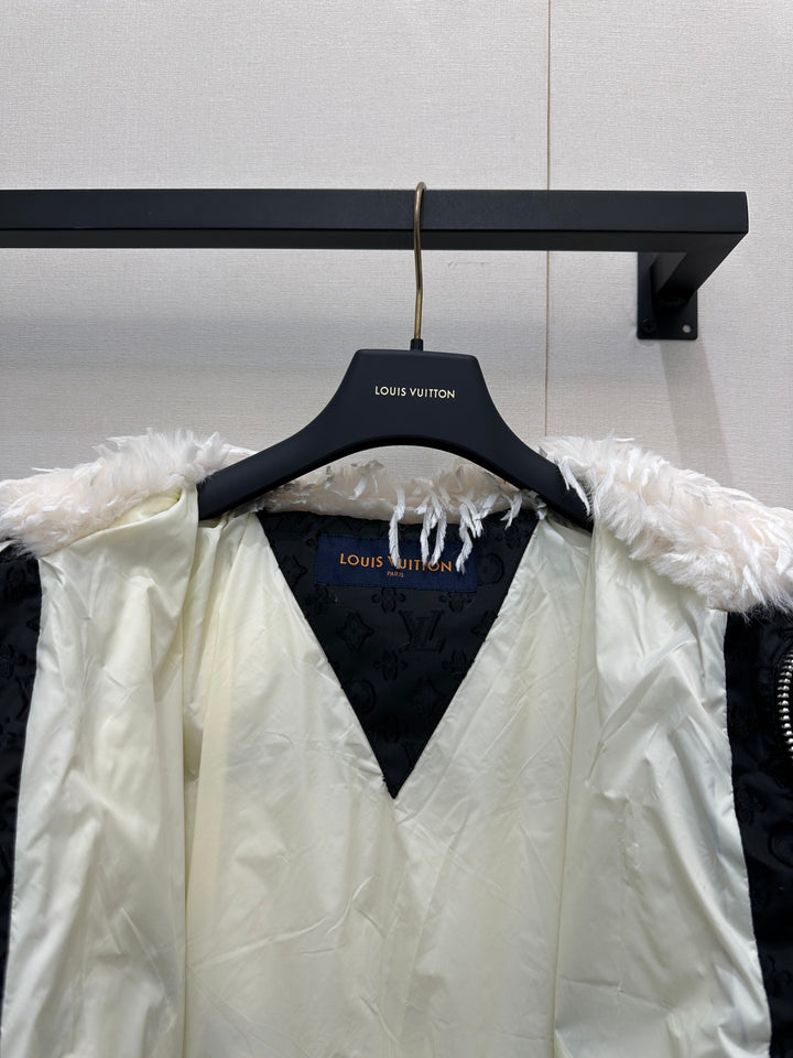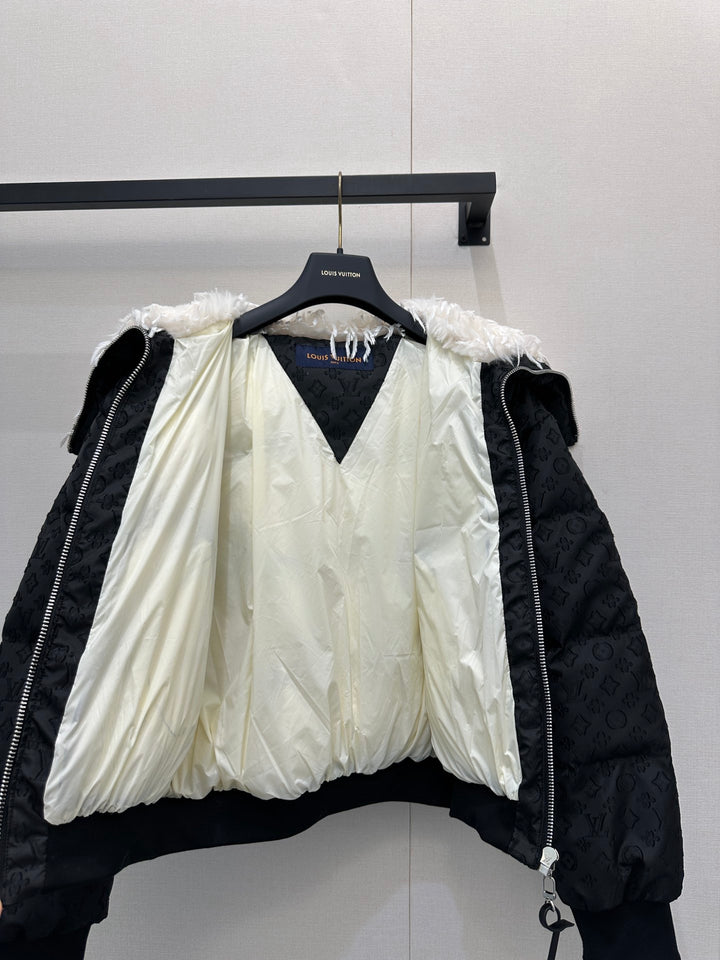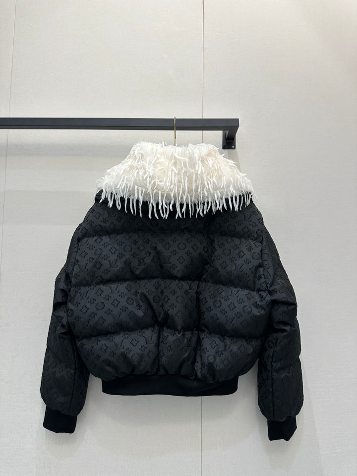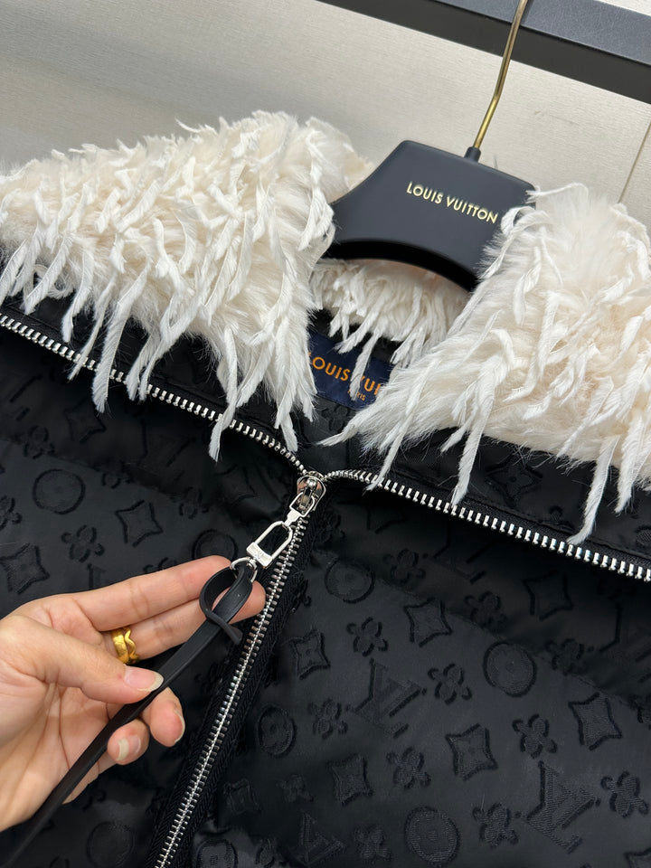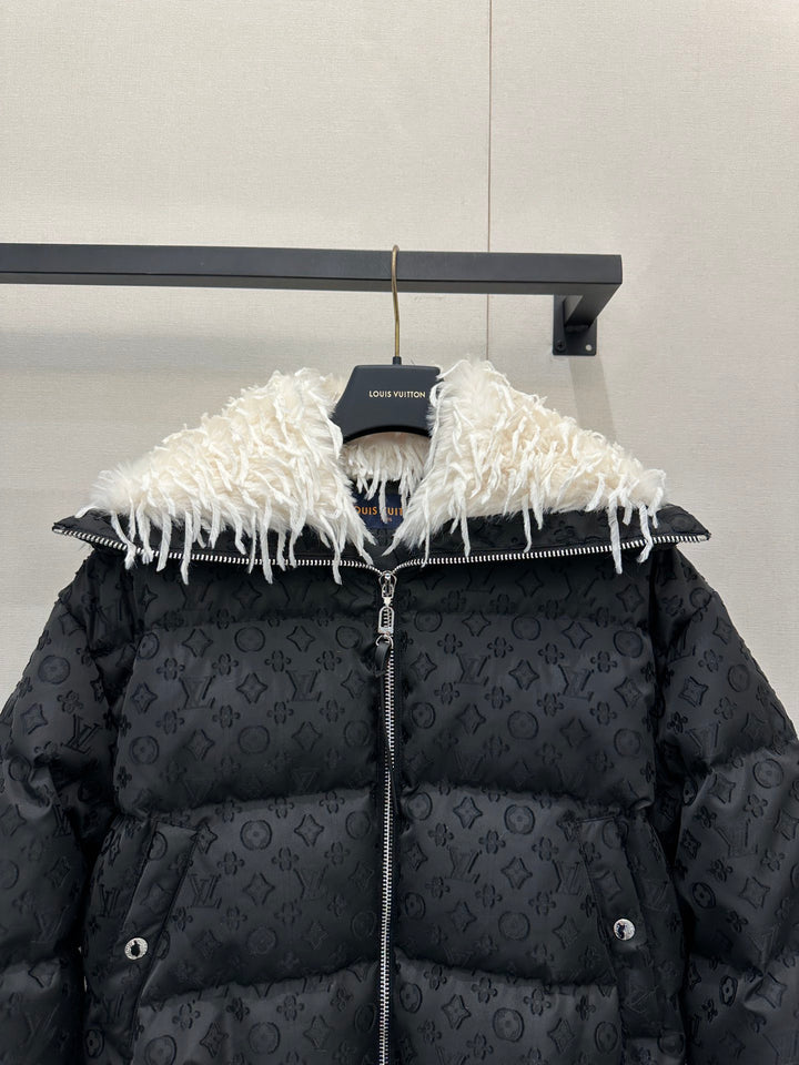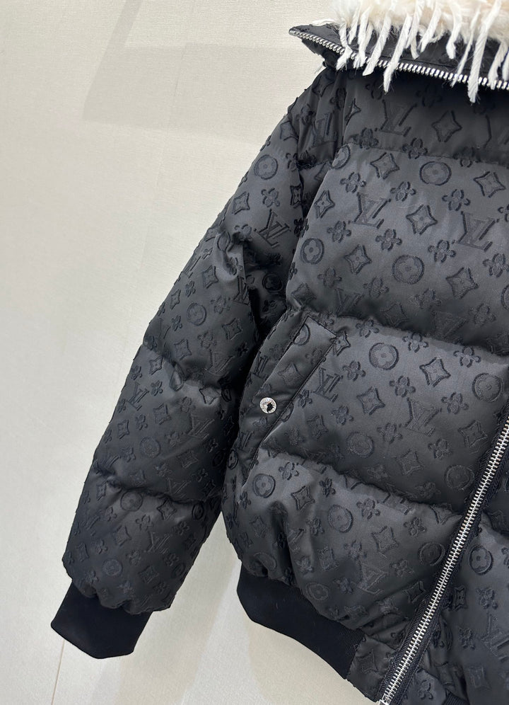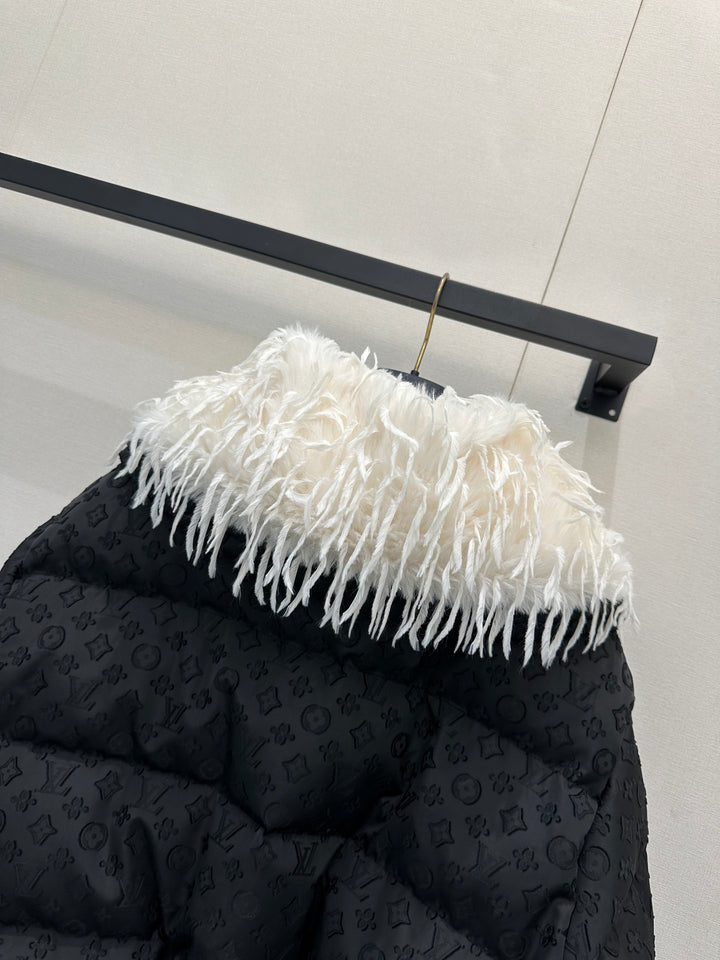 Selected Monogram nylon fabric with embossed patterns, white feather trim on the lapel, three-dimensional texture with hidden brand logo, matte black tone with a low-key luxury feel; Filled with high fluffiness down, it combines warmth and lightness, suitable for skiing scenes and daily dates!