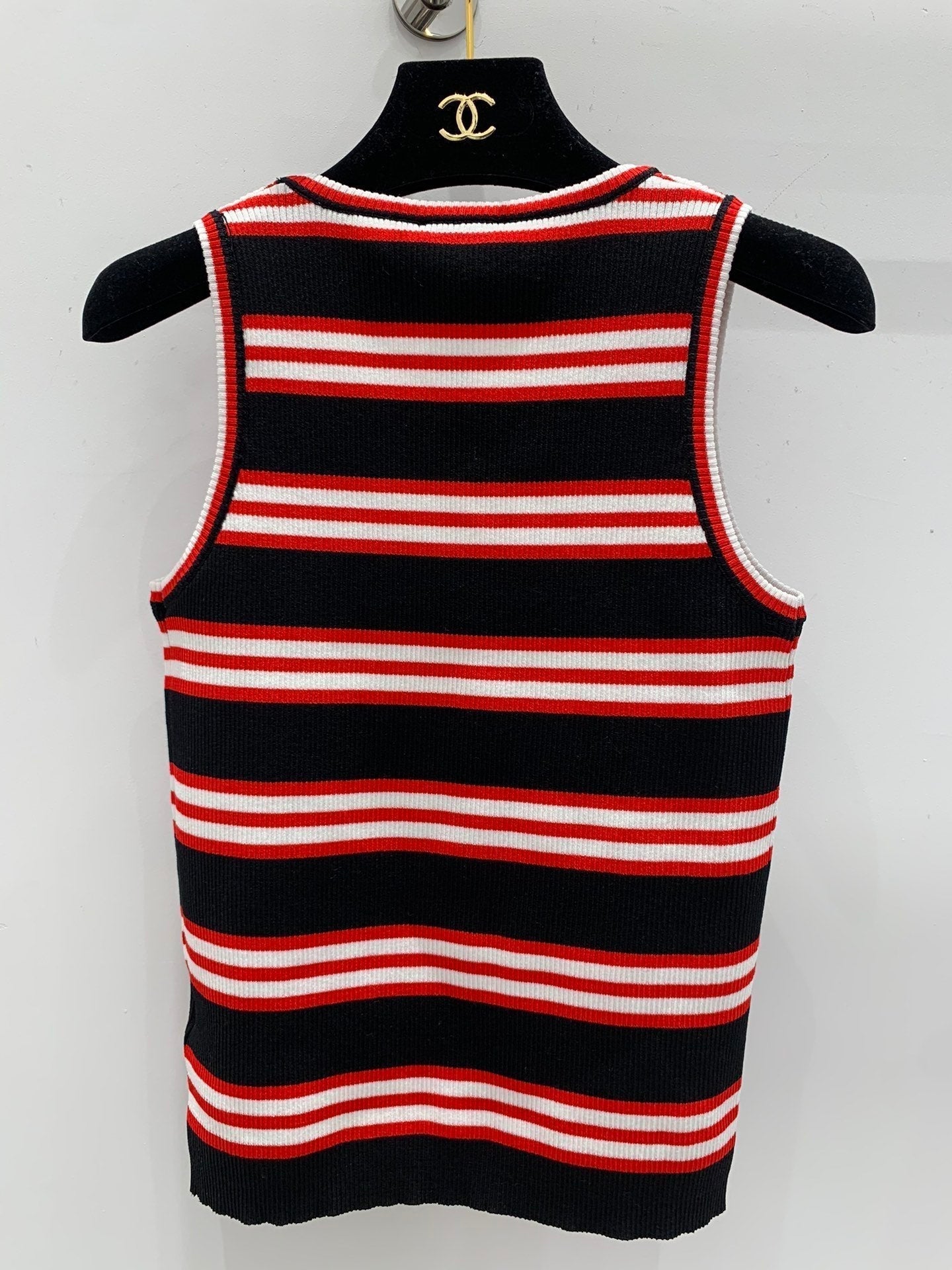 New knitted U-neck vest for spring and summer 🆕 Classic and timeless striped contrast stitching design, collar and cuffs with ribbed edges, classic double C logo embellishment, simple and versatile, size smlKnitted vest, imported 100% wool material, hollow knitted texture, logo decoration, overall high-end and simple, can be worn alone or layered, suitable for all seasons when worn aloessalicne. Single product, simple design, fashionable and high-end