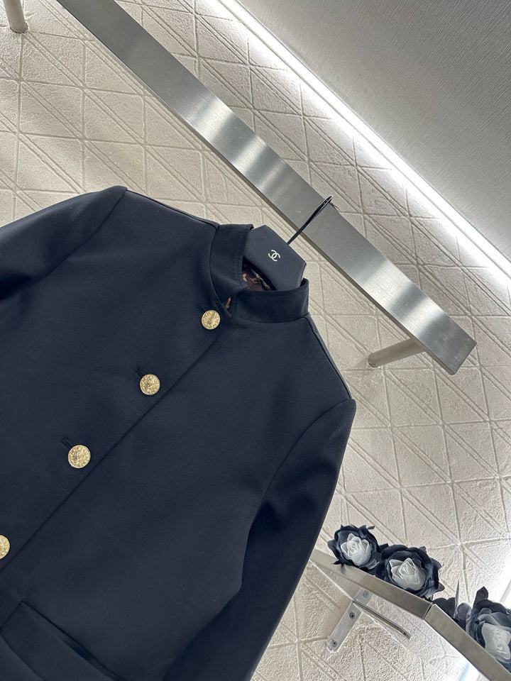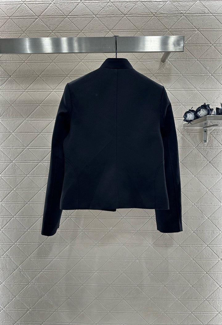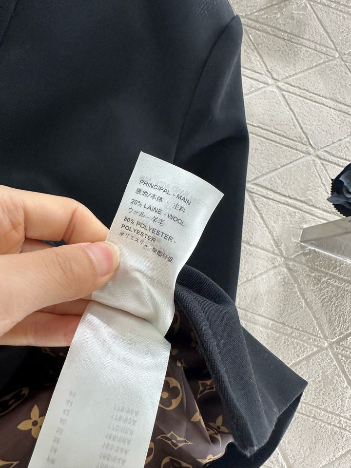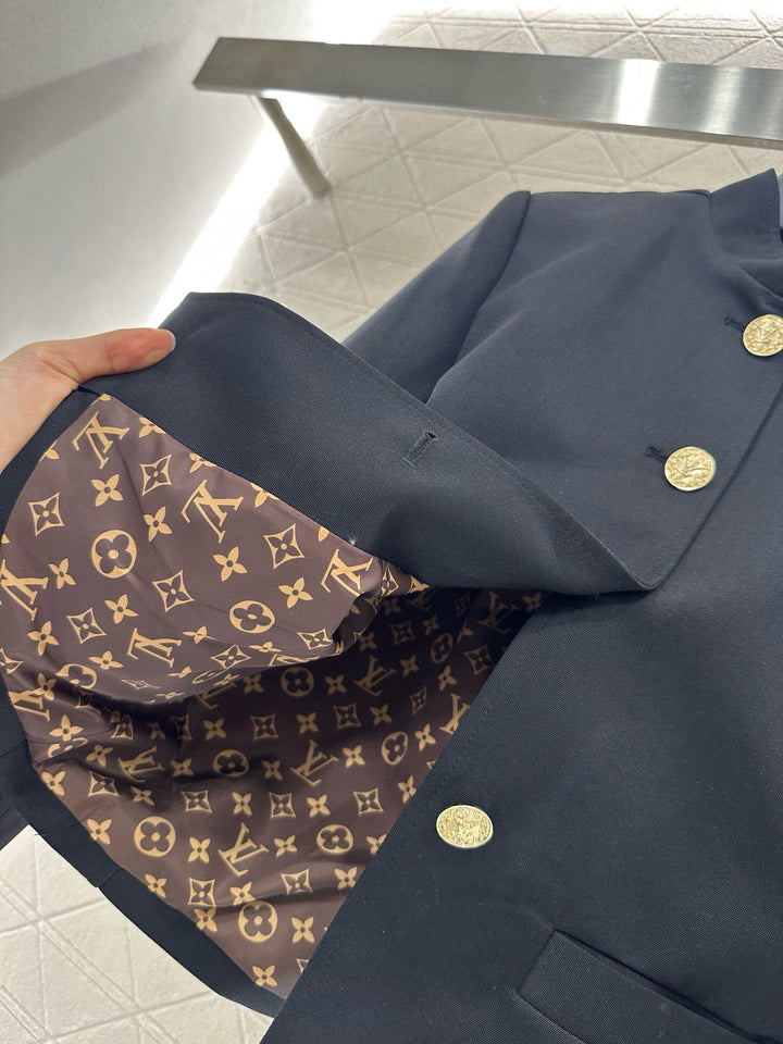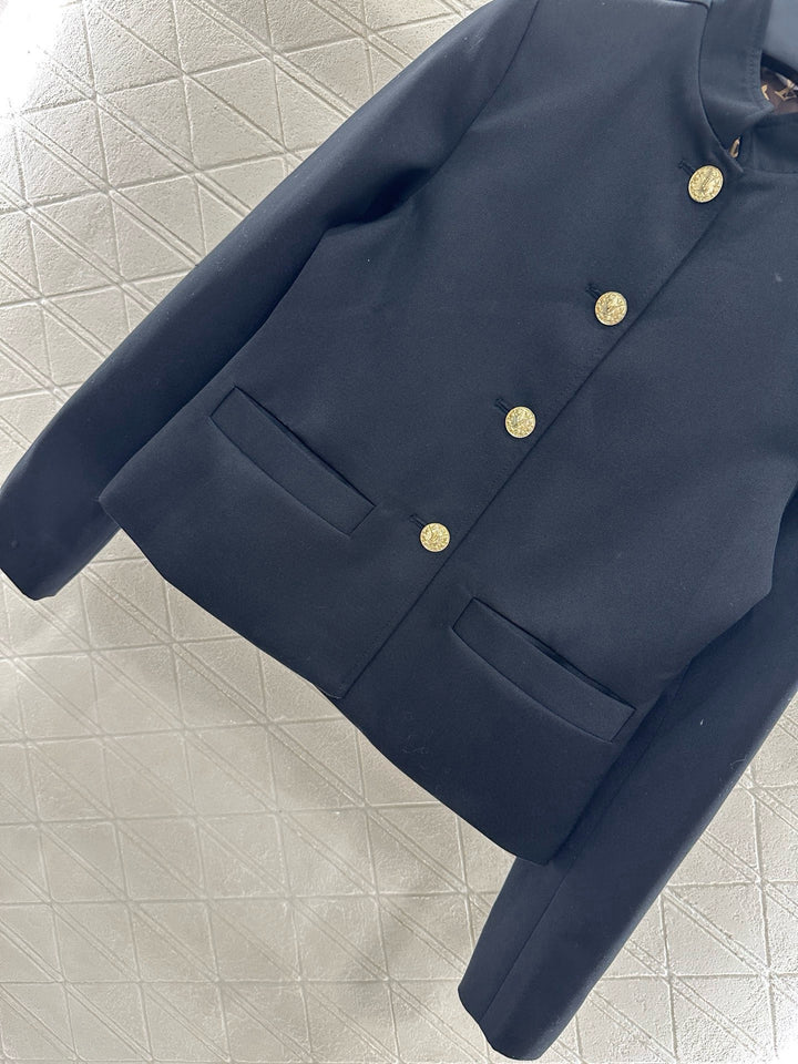 Wool material, processed with a smooth touch, presents a crisp texture. The slim fitting stand up collar suit fits snugly against the body, making it appear more upright and prominent. The printed frosted letters and buttons are rich in visual effects. The symmetrical pocket decoration ratio highlights the slimming beauty of the upper body. The lining is full of iconic floral details and texture. It is matched with the same series of wide legs, straight tubes, and elongated ratios, making it more stylish. Commuting and attending important occasions showcase a luxurious taste.