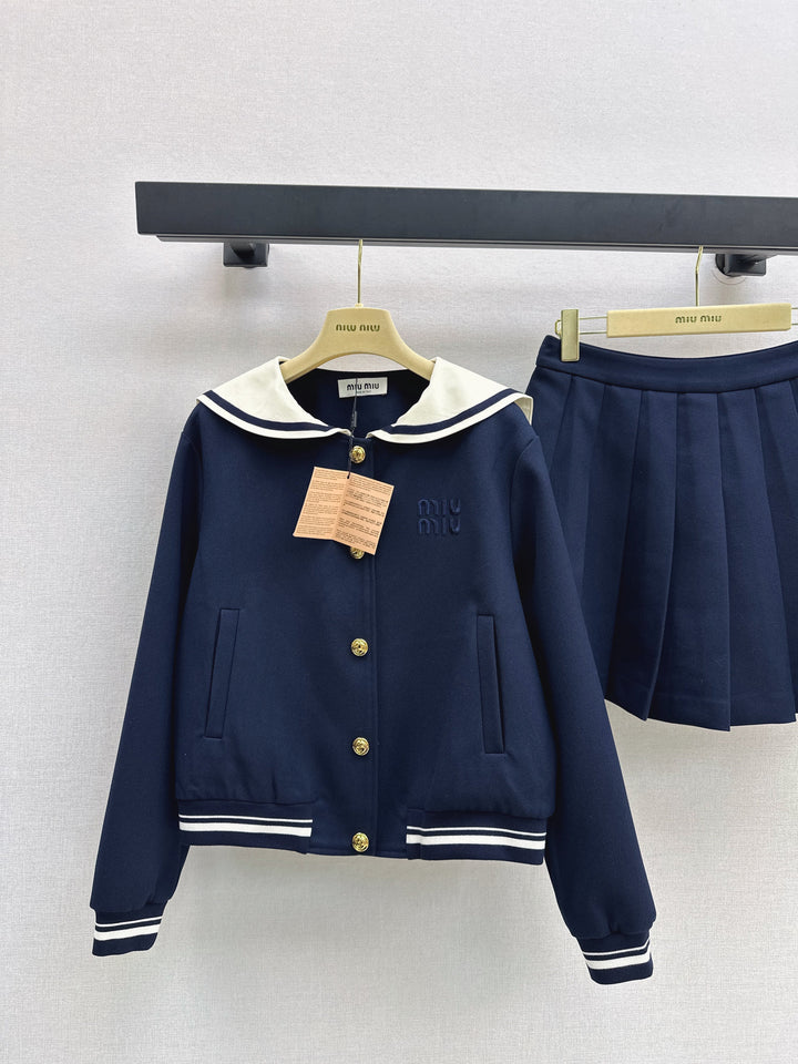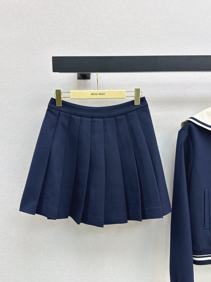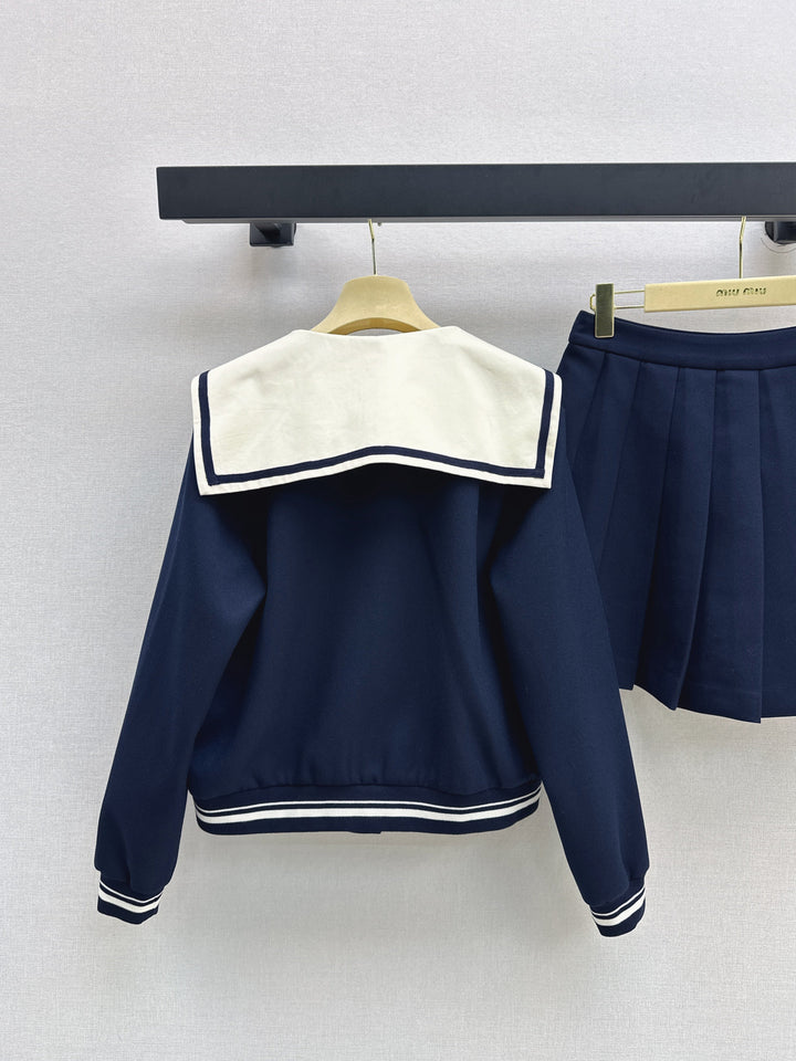 Navy contrasting lapel jacket+pleated half skirt with a super western-style silhouette, effortlessly exuding a casual high-end fashion. The overall simple and elegant silhouette is comfortable to wear, intellectual and atmospheric, creating a cool and luxurious feeling.