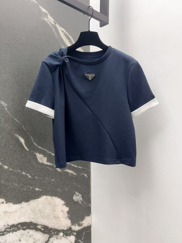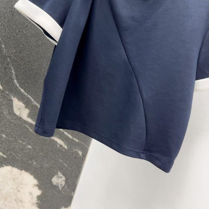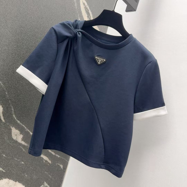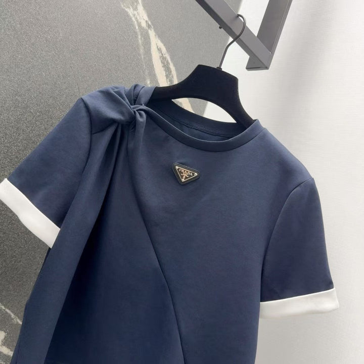 25ss———Spring and summer new product college style contrast color leisure classic triangle label twisted short sleeves with slit skirt casual casual feeling a set of matching version of the upper body is very thin high-quality pure cotton fabric light breathable without losing the sense of crispness close to the body very comfortable age-reducing leisure style lazy and fashionable daily wear essential
