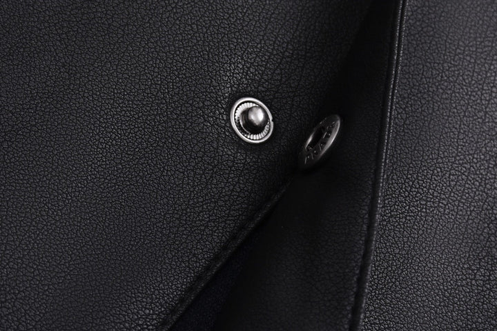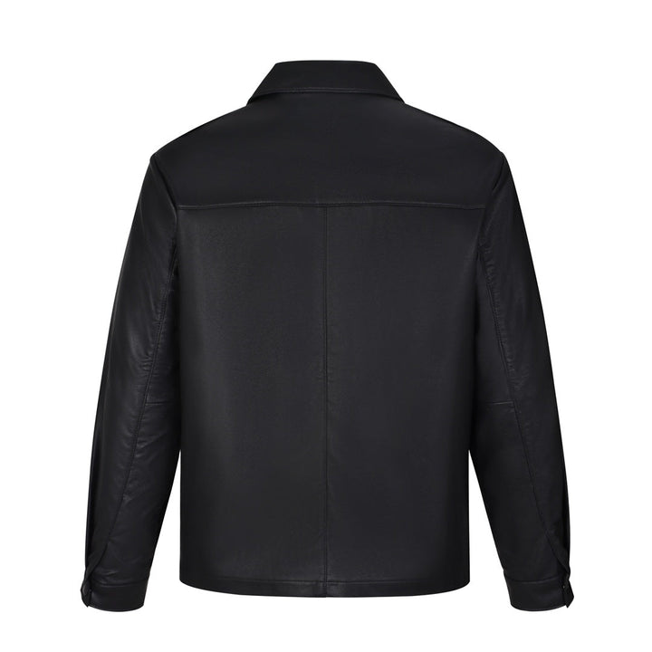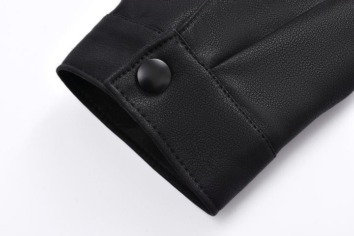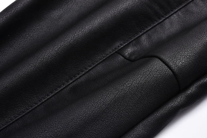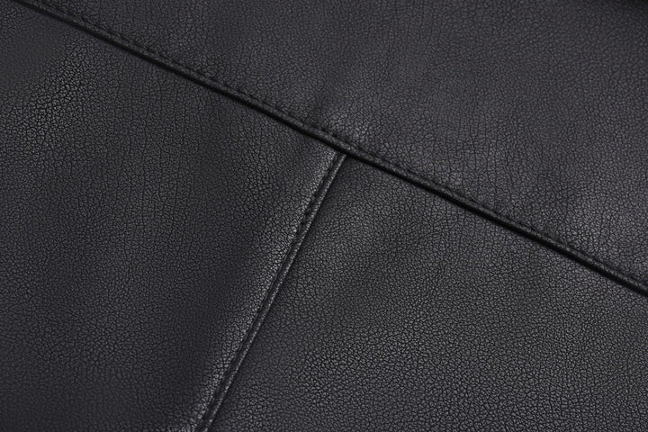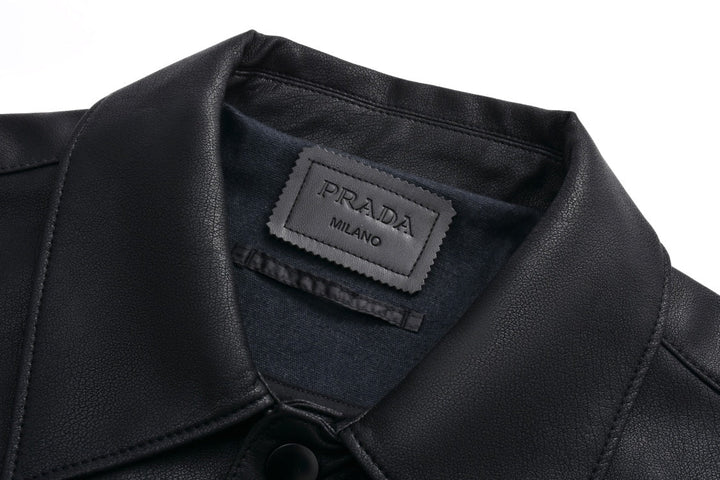 The surface is made of soft sheep leather custom-dyed Pantone 11-0601 black, composite polymer polyester fiber, and lined with custom-dyed thin velvet blue-gray lining. The collar label is embossed with lettering and is cut with wavy piping. The chest is custom-made with a leather-based triangular iron plate. The placket and cuffs are all lacquered with lettering-based opening and closing buttons.