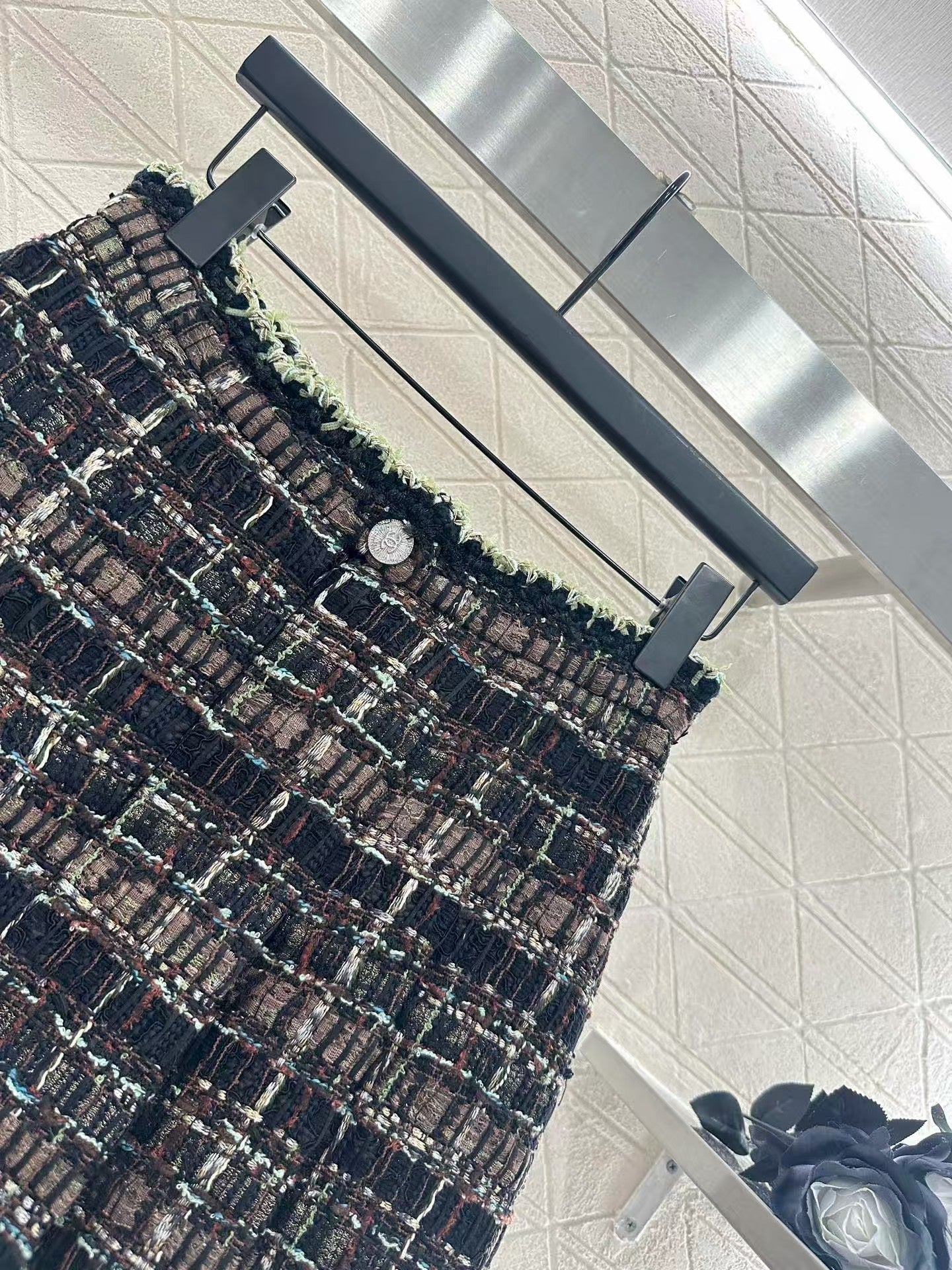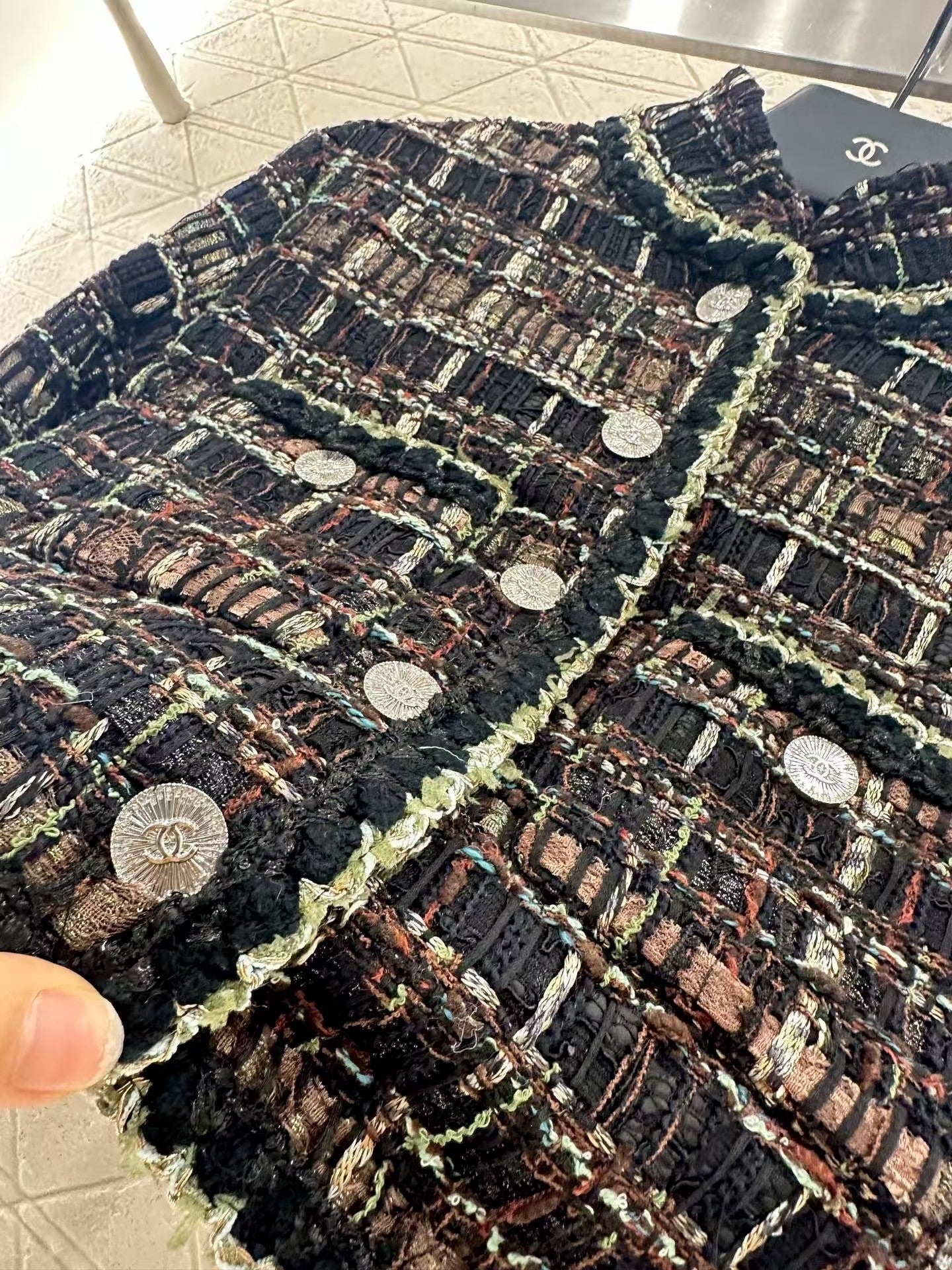 25 new models of the early autumn series, high-end handmade Chanel style jacket + skirt, made of imported heavy-duty twill soft tweed fabric, the fabric is super textured, round neck, single-breasted double pocket design, unique metal button decoration embellishment, showing the unique charm of Chanel style, 3D three-dimensional tailoring, classic short version, slimming, exquisite gold and black combination, unexpected harmony, the color upper body is super gorgeous and aristocratic, the length of the skirt is just right, covering the crotch and showing the length of the legs