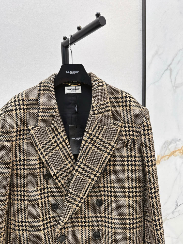 The woven wool plaid fabric has an excellent texture - simple and atmospheric, fashionable yet elegant with padded shoulder design. It is very confident in its silhouette and will not go out of style for ten thousand years. The details and texture are all online.