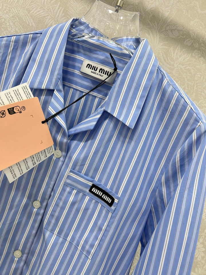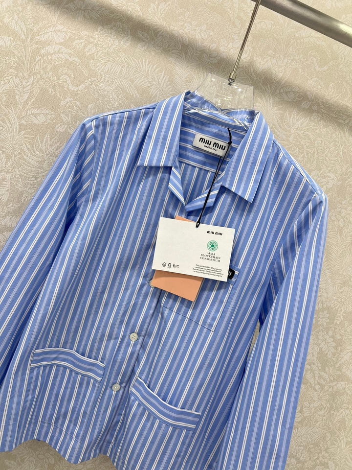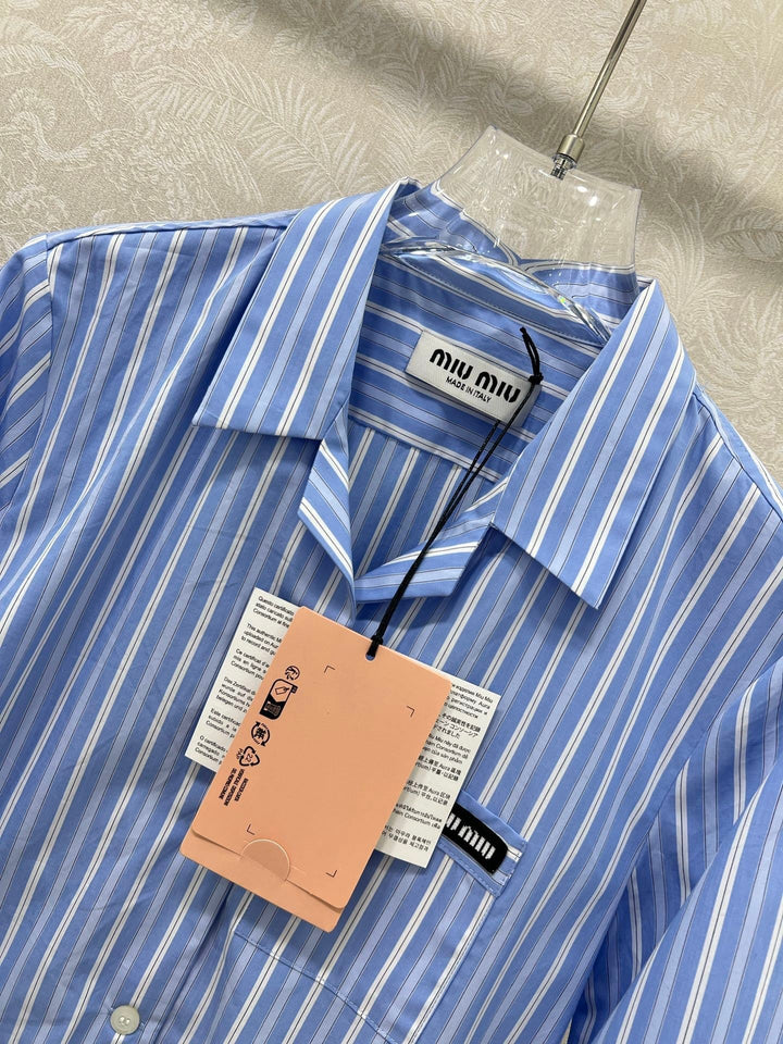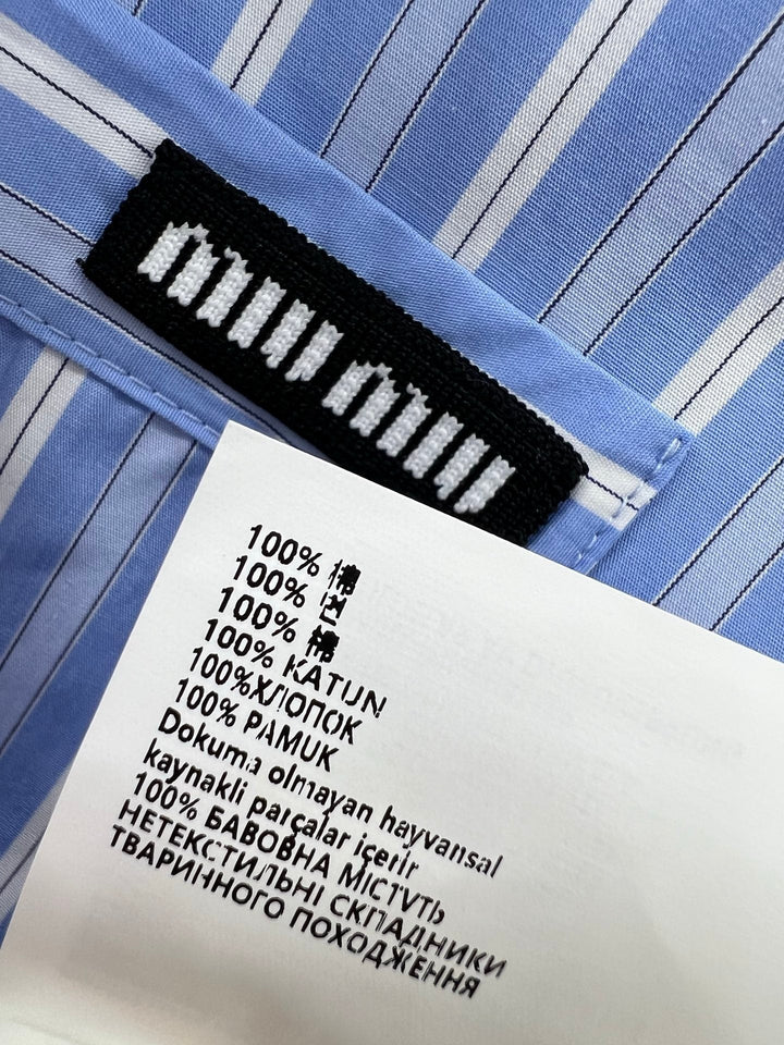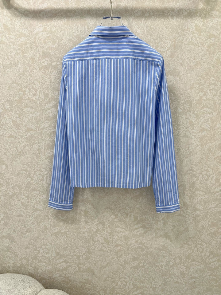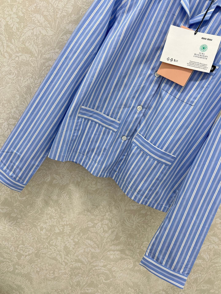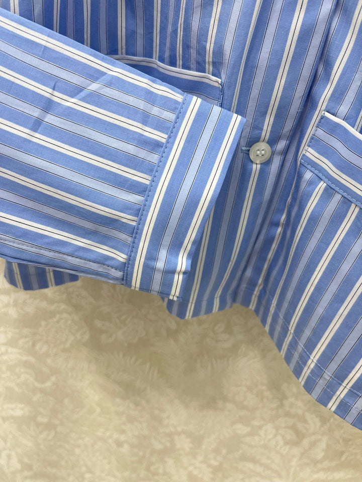 Skin-friendly and comfortable, moisture-wicking and breathable. The whole body is interwoven with vertical blue and white stripes. It is loose and fashionable with a full sense of literary and old money. The lapel and multiple pockets are decorated with letter logos on the chest. Paired with the same series of elastic waist straight-leg, the logo echoes for a more refined look. The whole set is fashionable and lazy, full of holiday leisure feeling.
