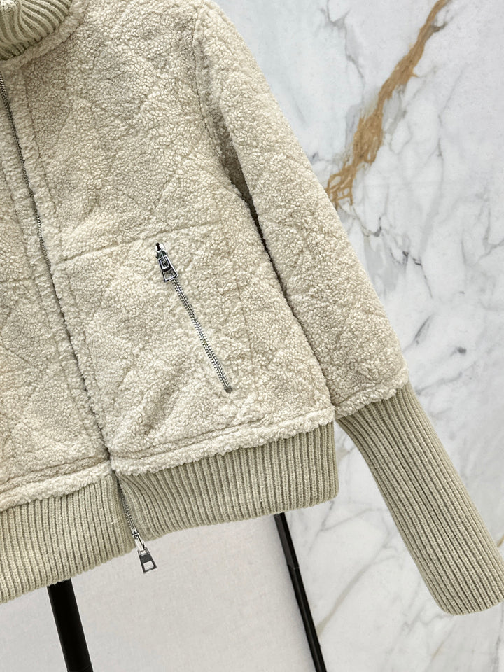 The material texture is delicate and comfortable to wear with a stand up collar zipper jacket. The design concept is double-sided, with one side featuring a rattan grid pattern, lamb wool particles, obvious plush warmth, and the other side featuring an elk leather ribbon for more dressing styles. The collar edge, cuffs, and hem are knitted with grooves, threaded edges, and a snug fit for warmth, simplicity, and luxury. Daily wear is fashionable and stylish.