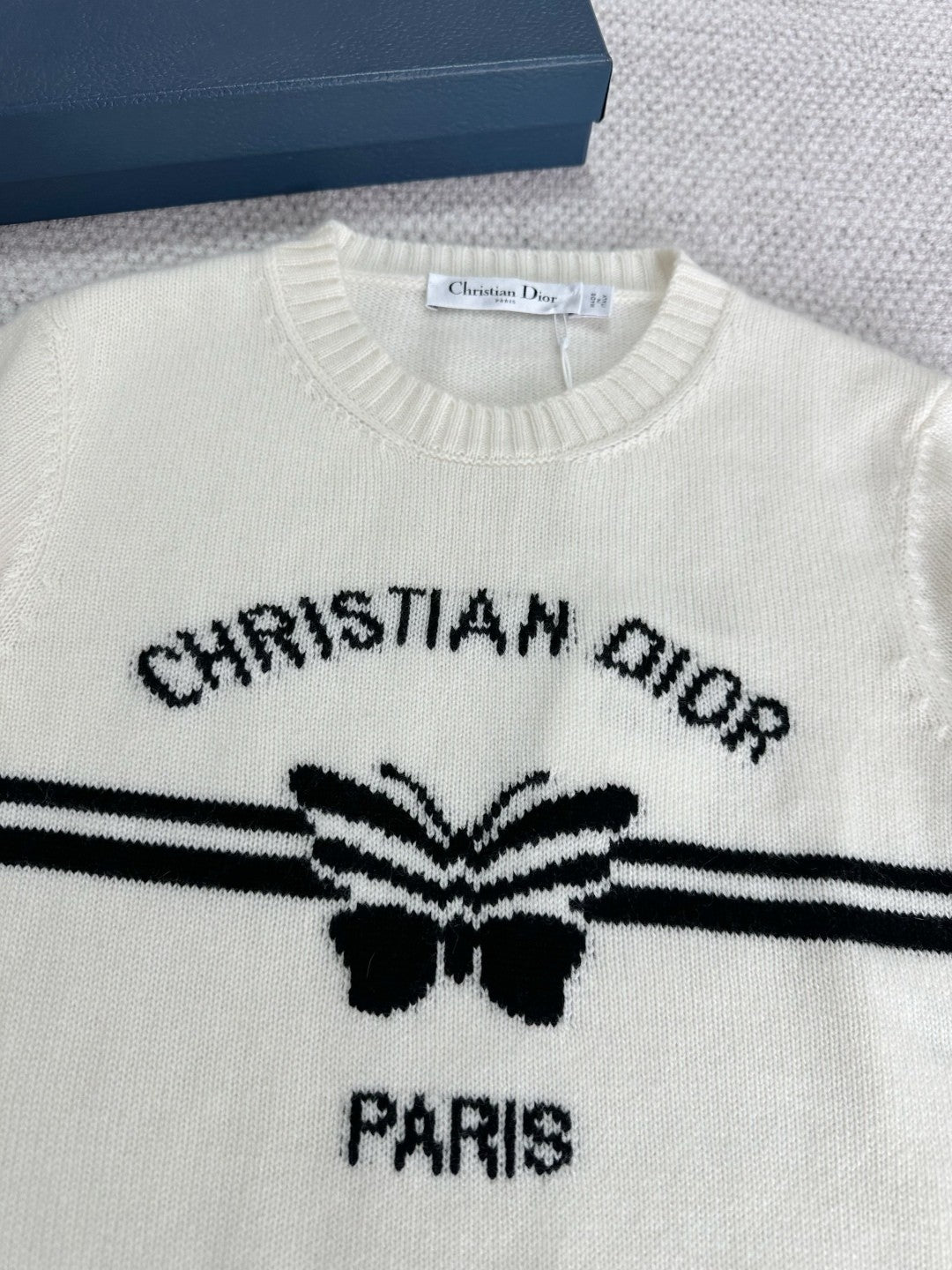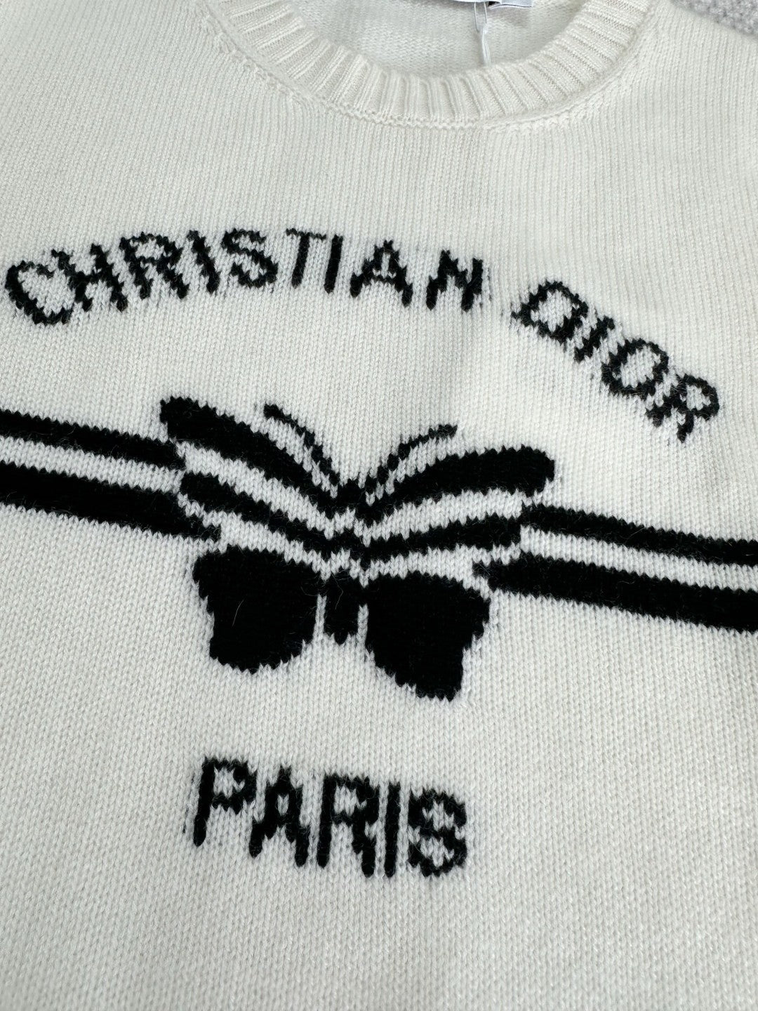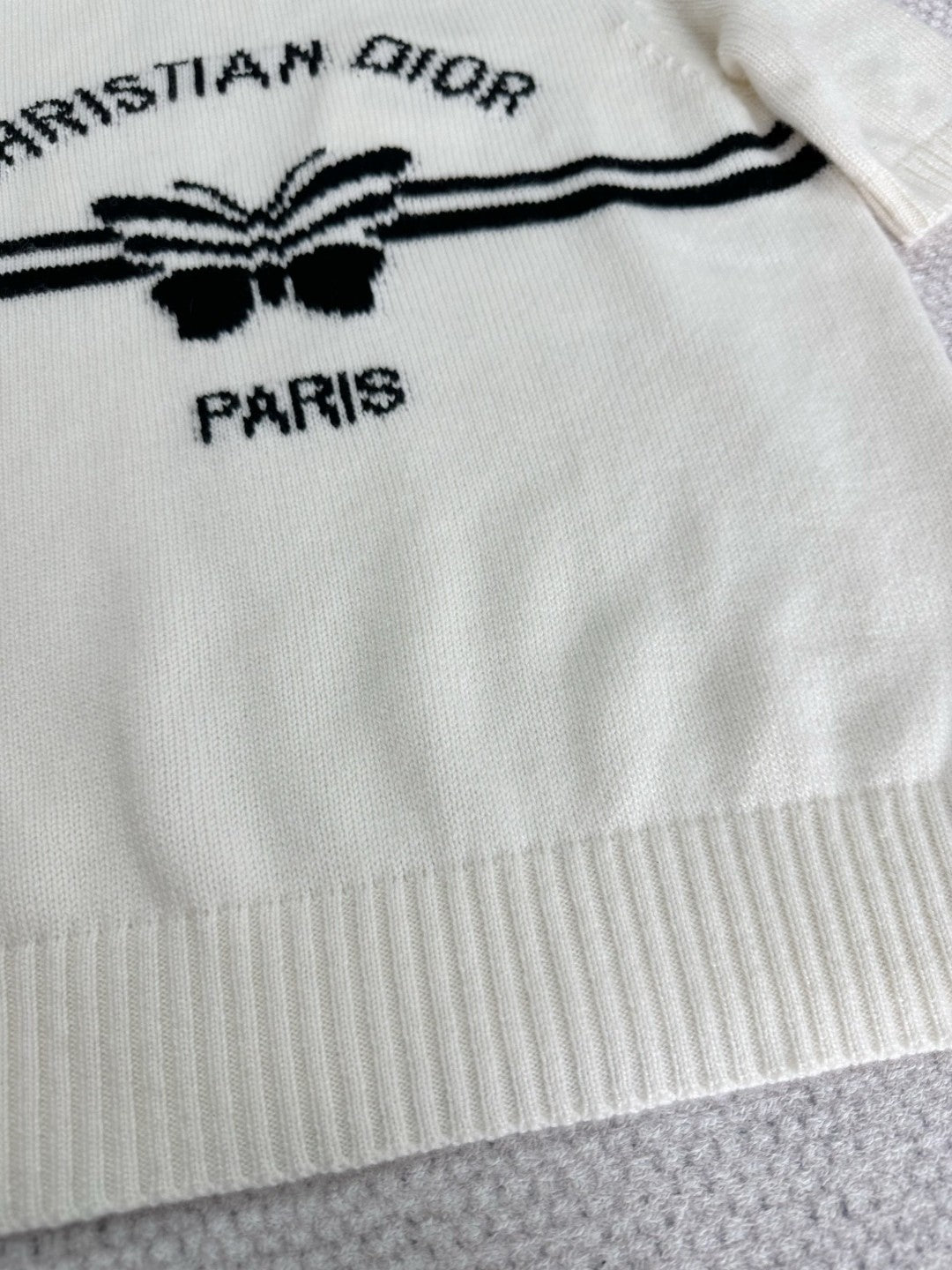 This new style for Spring/Summer 2025 combines modernity and elegance. Crafted from off-white cashmere fabric, it features butterfly and brand lettering motifs on the short sleeves and ribbed trim, making it easy to pair with other items. 100% cashmere.